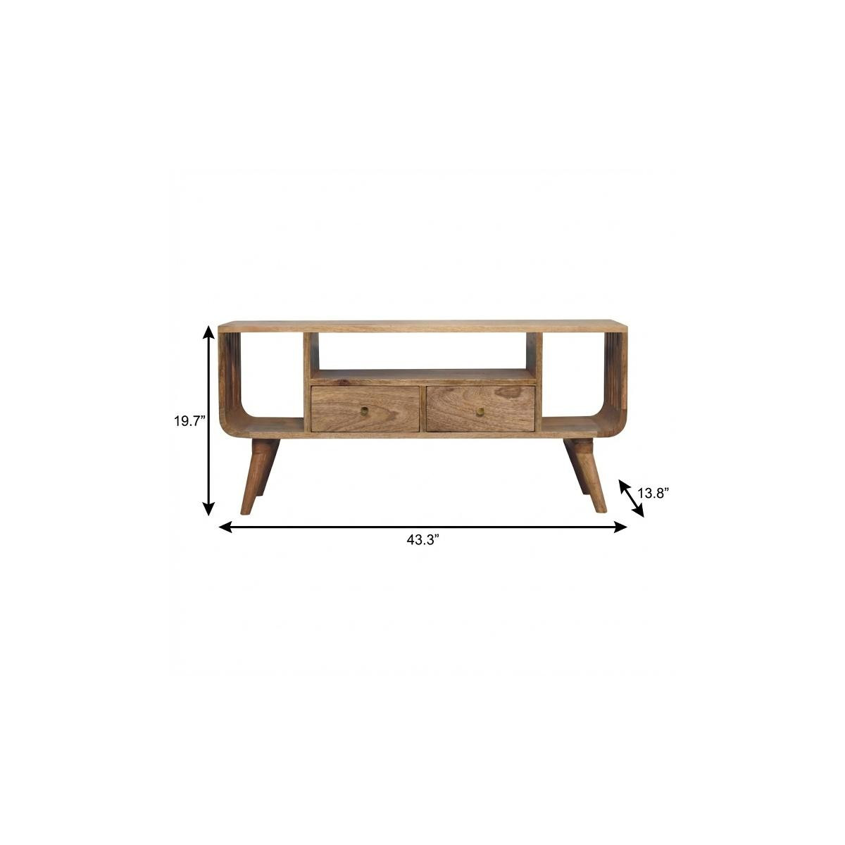 Create the ultimate blend of style, function, and design with this 43-inch brown solid wood enclosed and open storage tv stand. Designed to be sturdy and long lasting, this versatile furniture piece is crafted from durable solid wood and features a modern design style. A cord cut out hole is ideal for wire and cable management to keep your space look tidy. Ideal for tv placement and storage in your living room, bedroom or office. 19.70-inch h x 43.30-inch w x 13.80-inch d.