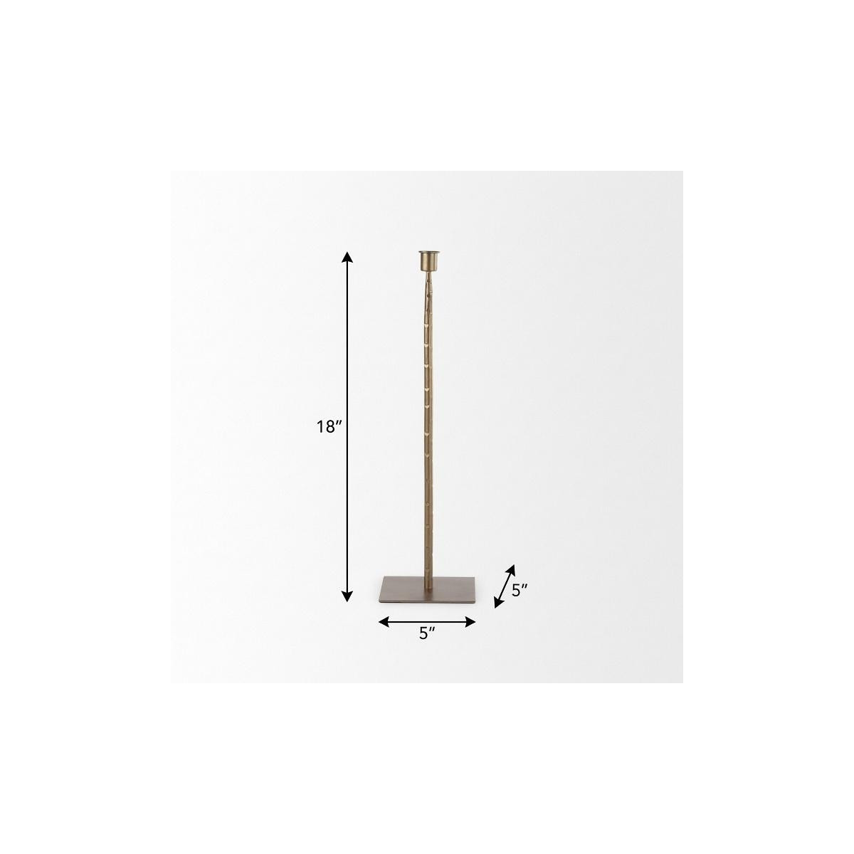This 18-inch gold metal floor taper candlestick is a great addition to your home decor and sure to complement your existing furniture. Hand finished by skilled craftsmen and designed to add a glamorous glow to any event or table setting. This candleholder is the perfect illuminating design to accent your space in style. Candleholders are an attractive way to turn a simple candle into a piece of décor. 18.00-inch h x 5.00-inch w x 5.00-inch d.