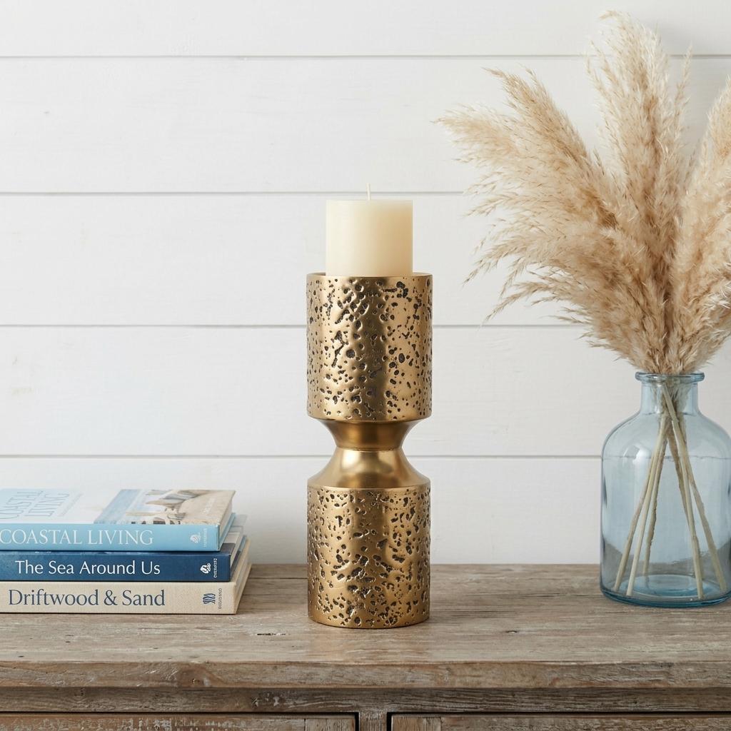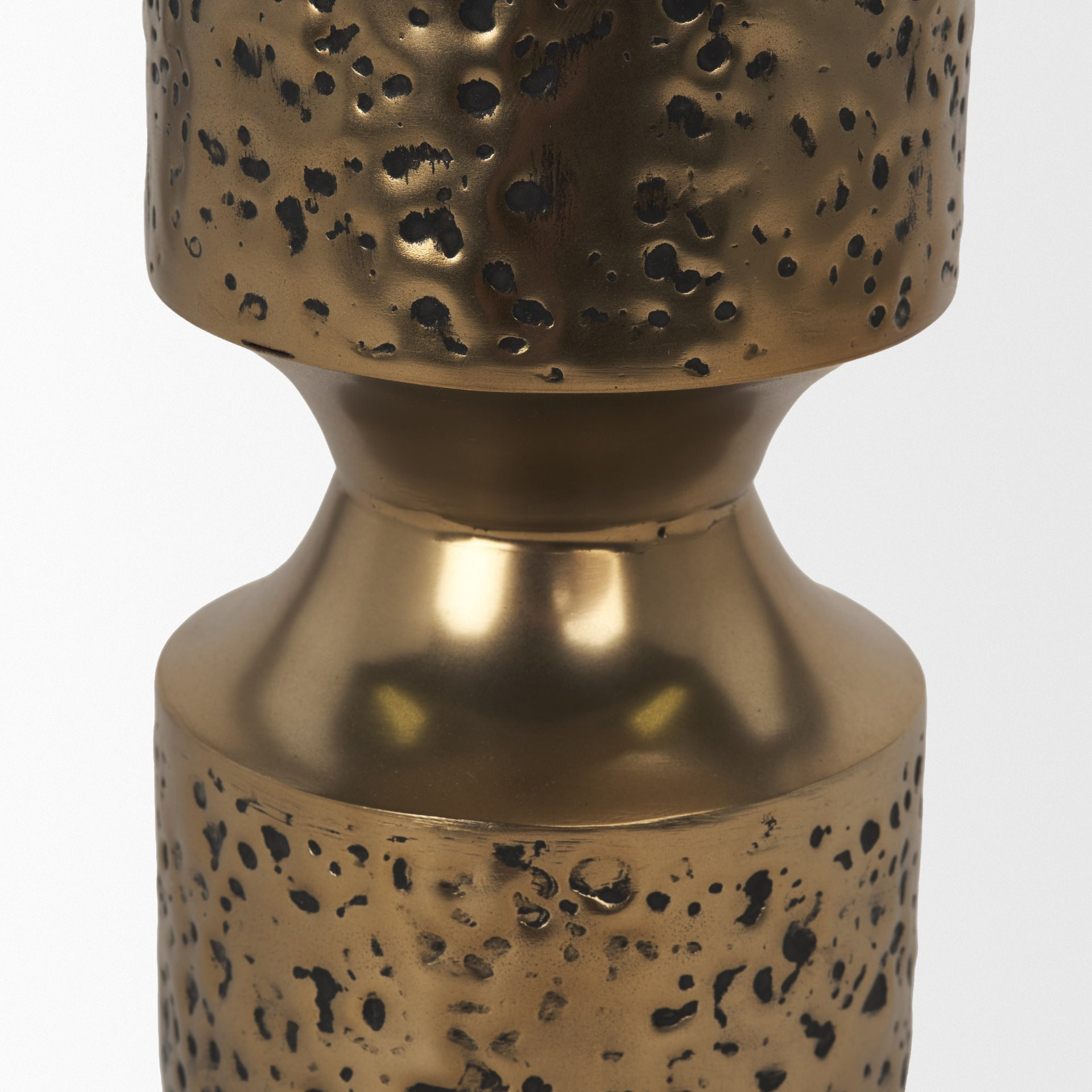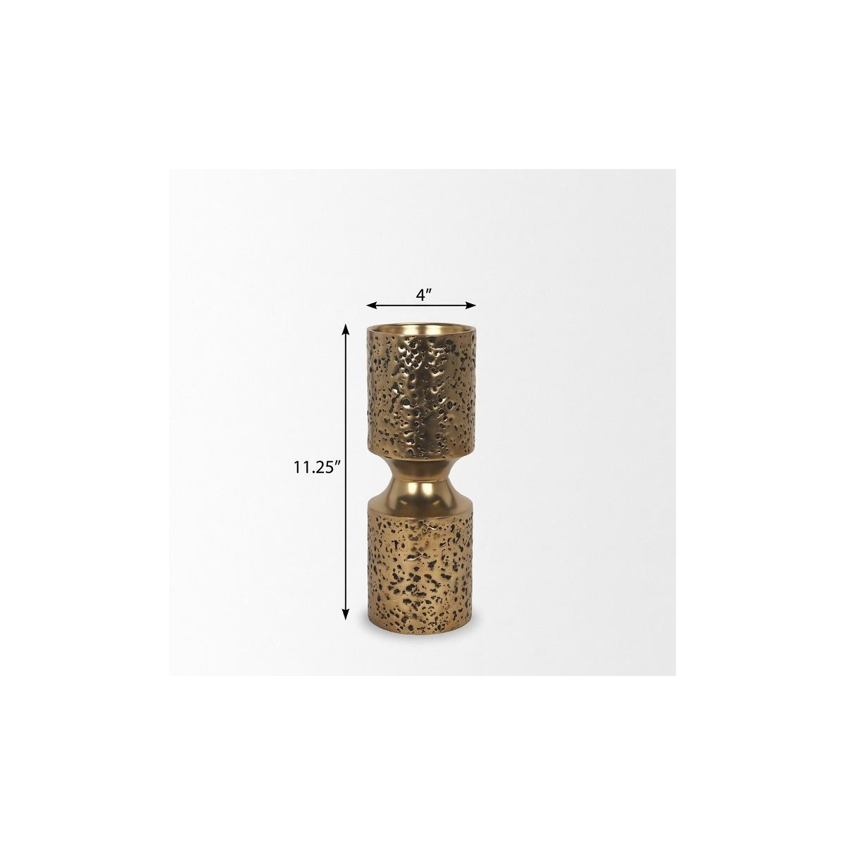 This 11-inch antiqued gold metal tabletop votive candle holder will bring warm candlelight and your favorite fragrance to any space. Hand finished by skilled craftsmen and designed to add a glamorous glow to any event or table setting. This candleholder is the perfect illuminating design to accent your space in style. Candleholders are an attractive way to turn a simple candle into a piece of décor. 11.25-inch h x 4.00-inch w x 4.00-inch d.