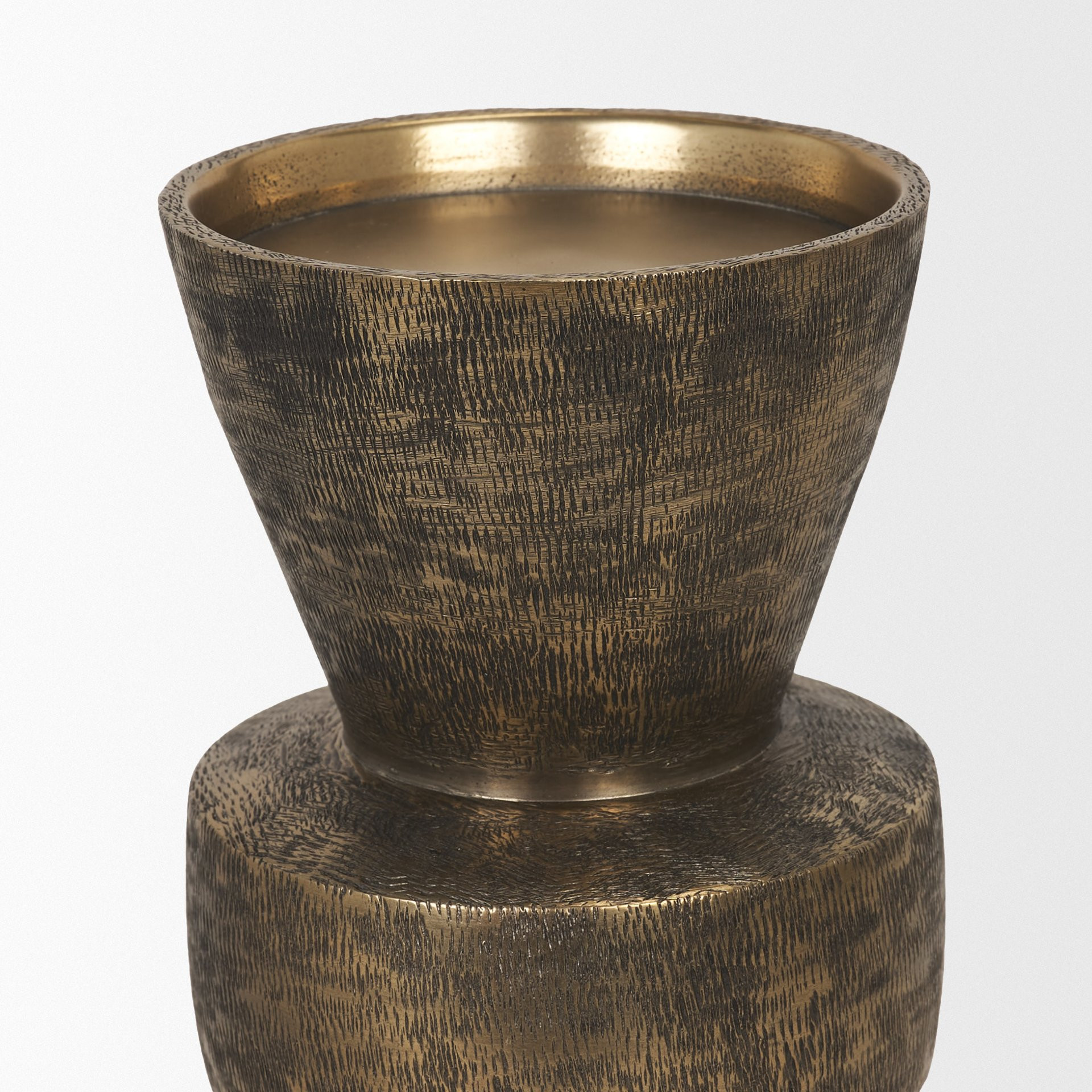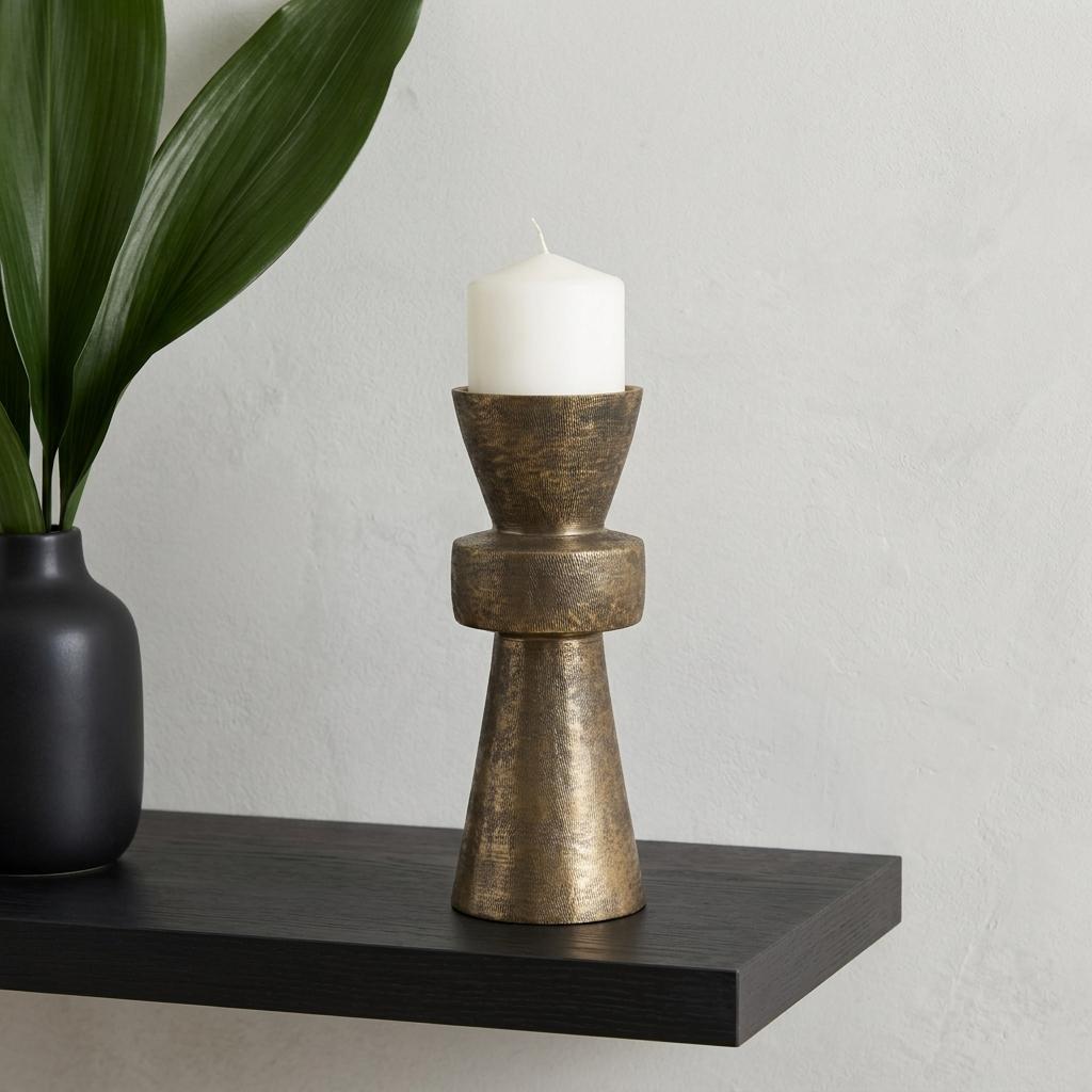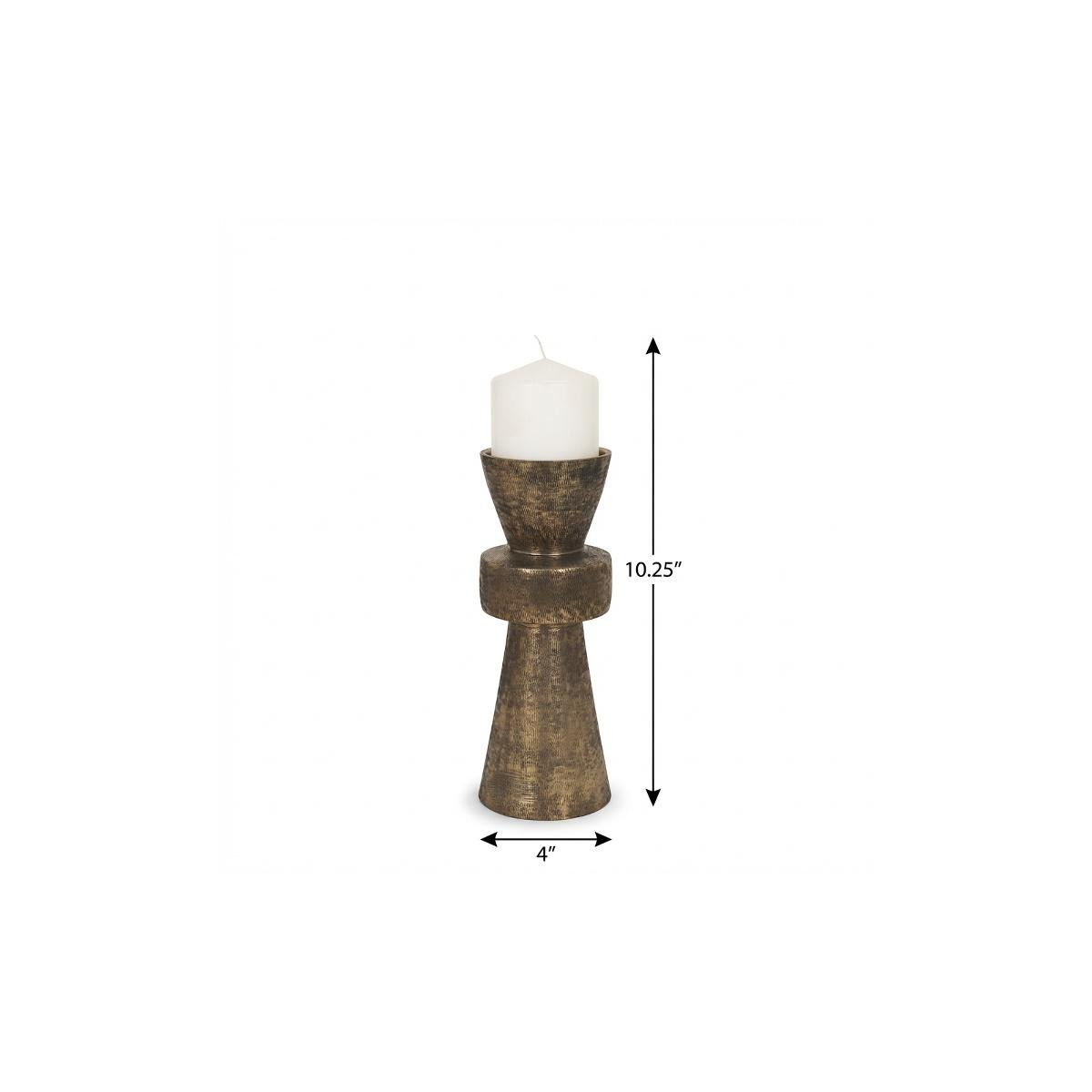 This 10-inch antiqued gold metal tabletop votive candle holder will bring warm candlelight and your favorite fragrance to any space. Hand finished by skilled craftsmen and designed to add a glamorous glow to any event or table setting. Add an extra pop of personality to every corner of your home with this gorgeous candleholder candleholders are an attractive way to turn a simple candle into a piece of décor. 10.25-inch h x 4.00-inch w x 4.00-inch d.
