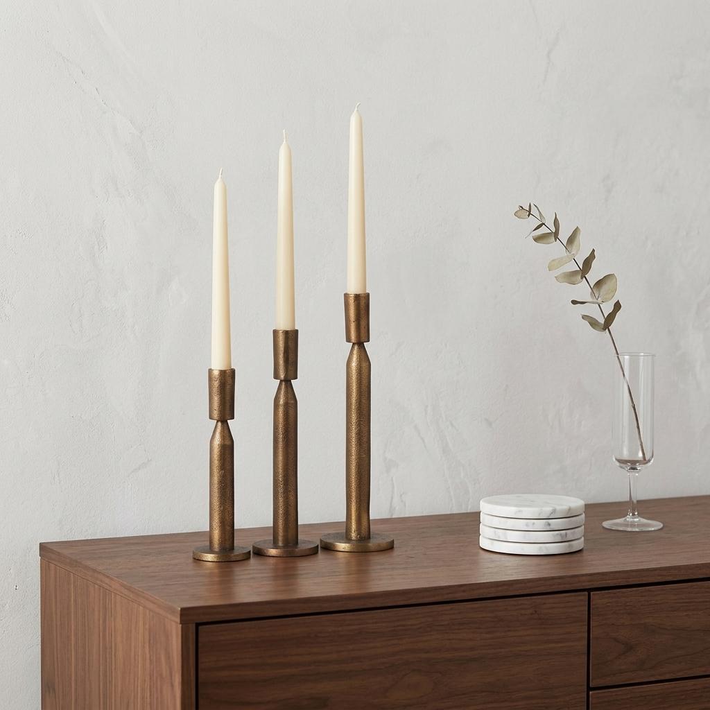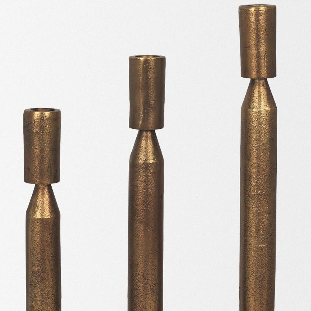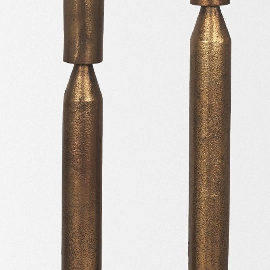 This set of three antiqued brass metal tabletop taper candlesticks is a great addition to your home decor and sure to complement your existing furniture. Hand finished by skilled craftsmen and designed to add a glamorous glow to any event or table setting. Sold as a set of 3, this candleholder gives your space radiant illumination. Add an extra pop of personality to every corner of your home with this gorgeous candleholder candleholders are a decorative accent on their own, with or without candles. 13.75-inch h x 3.75-inch w x 3.75-inch d.