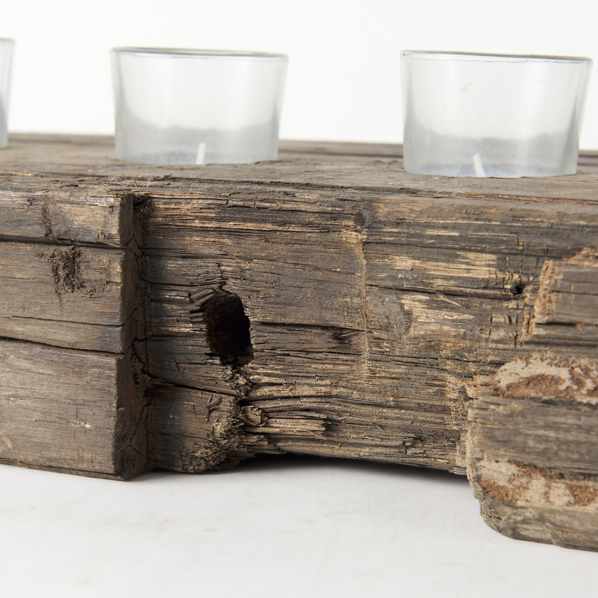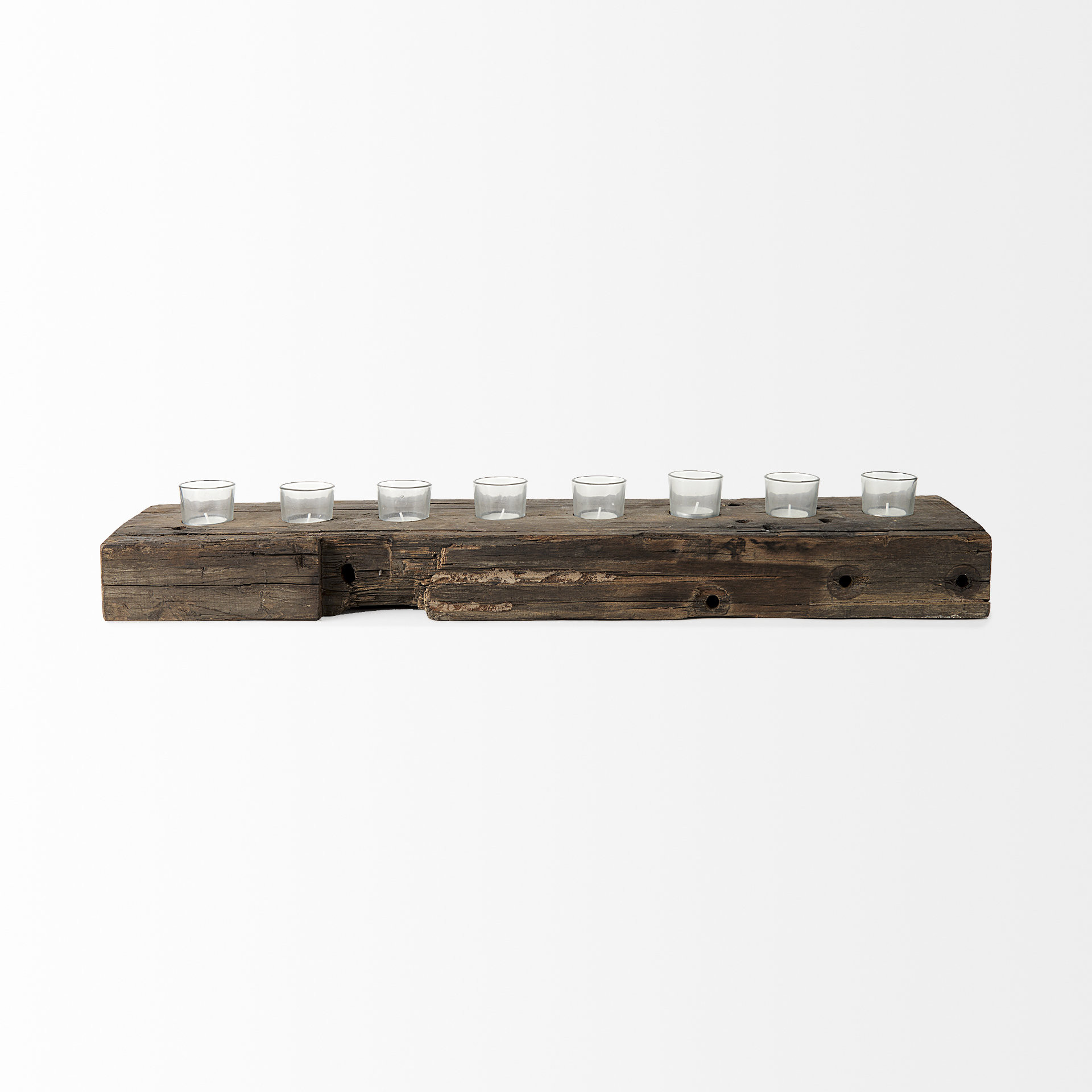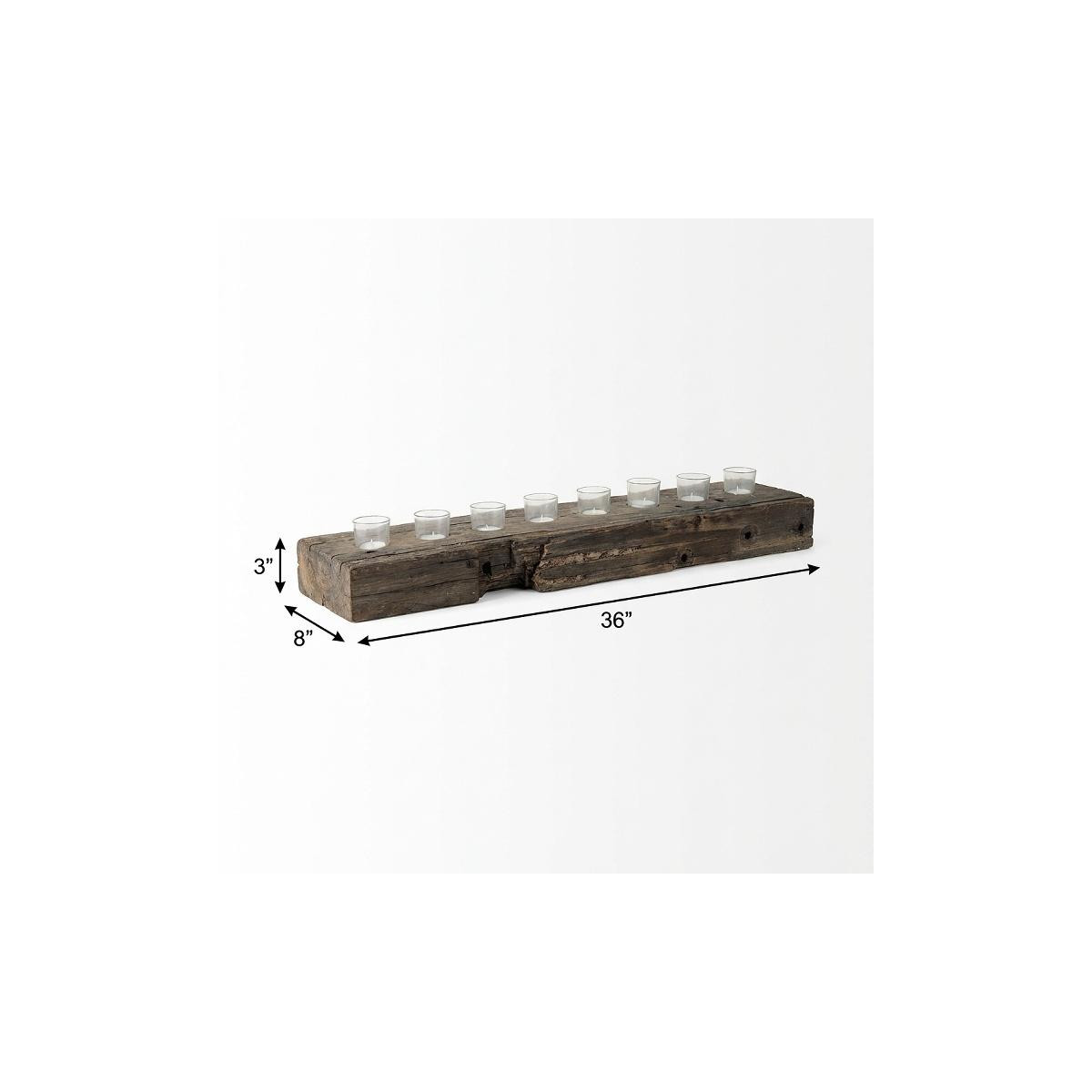 This 3-inch brown solid wood tabletop votive candle holder is perfect for placing on dining room tables or living areas for an effortless ambient aesthetic. Hand finished by skilled craftsmen and designed to add a glamorous glow to any event or table setting. Dress up your home to impress every season with this fabulous candleholder. Candleholders are an attractive way to turn a simple candle into a piece of décor. 3.00-inch h x 8.00-inch w x 36.00-inch d.
