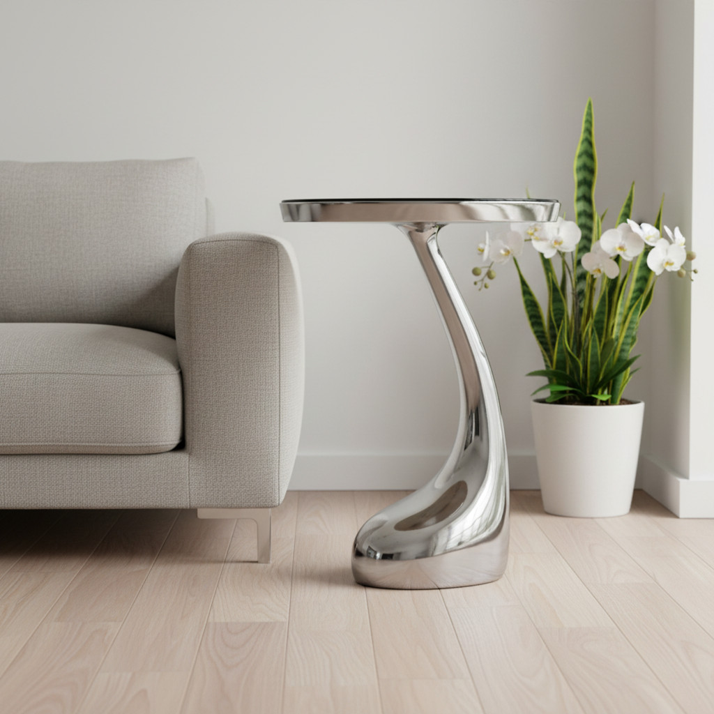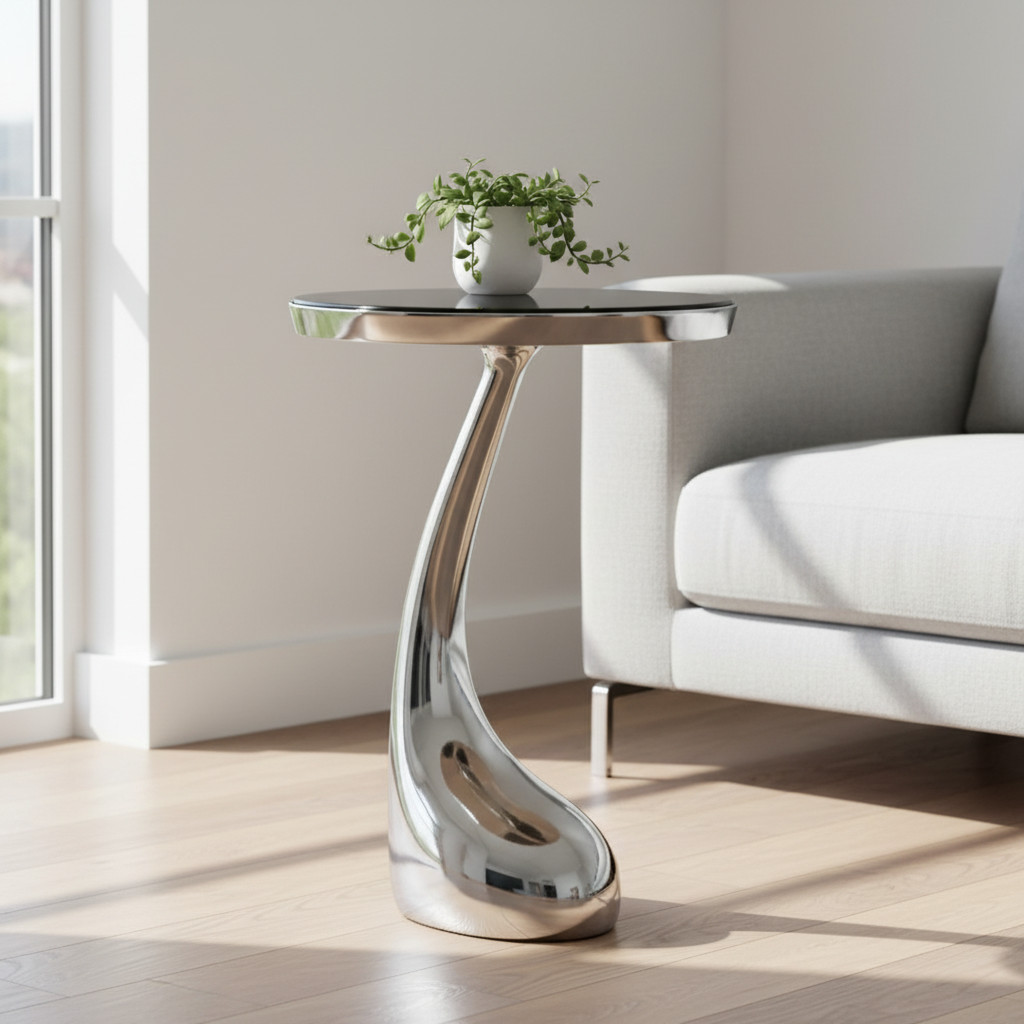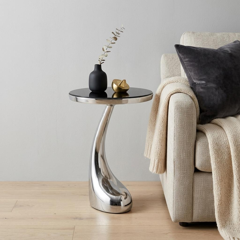Show off your exquisite taste with this 21-inch silver granite and aluminum free form pedestal end table. The silver coloration runs throughout this good looking aluminum and granite table. Side tables are a great way to flank your sofa, use as an accent next to your favorite chair, or can even be used bedside. You can also use it as an entryway table to hold your keys. 21.00-inch h x 14.75-inch w x 14.75-inch d.