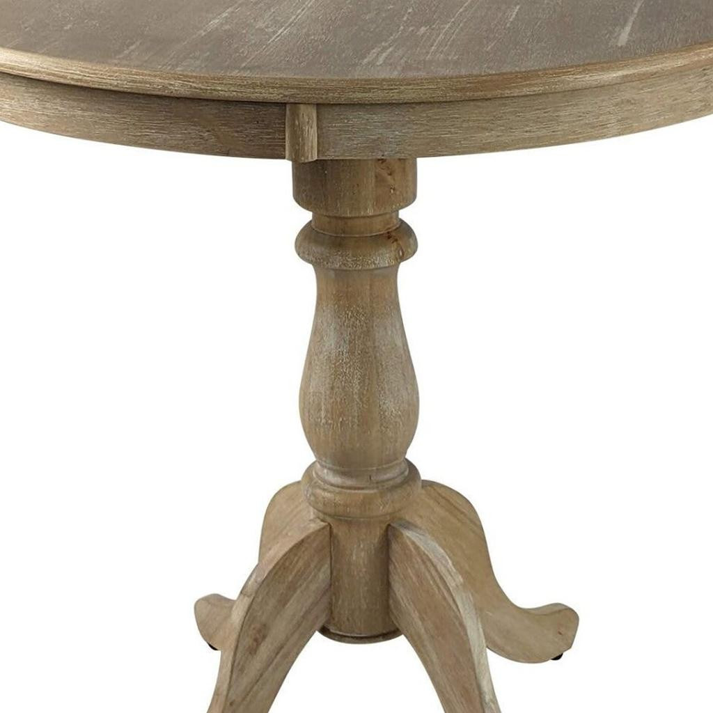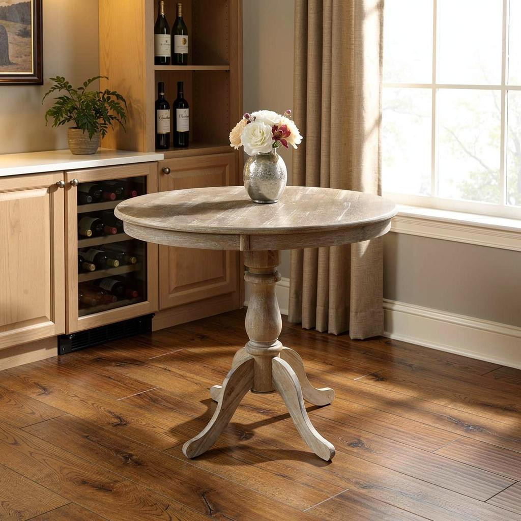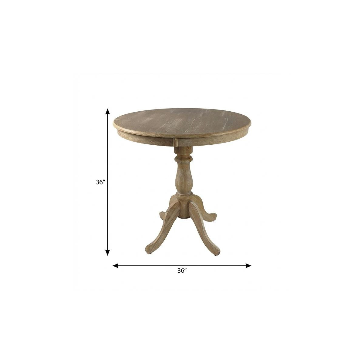 The 36-inch natural solid wood rounded bar table is a beautifully designed piece that captures the essence of traditional style. Crafted from solid wood, both the top and base showcase a stunning natural color that enhances any decor. The round shape adds a classic touch, while the pedestal base provides stability and elegance. Featuring purposeful coat and paint distressing, this table brings character and charm to your space. Its fixed table mechanism ensures durability, making it perfect for both casual and formal gatherings. Each piece is hand crafted, guaranteeing unique attention to detail and quality construction. Ideal for bars, restaurants, or home entertainment areas, this table creates a welcoming atmosphere for guests. 36.00-inch h x 36.00-inch w x 36.00-inch d.