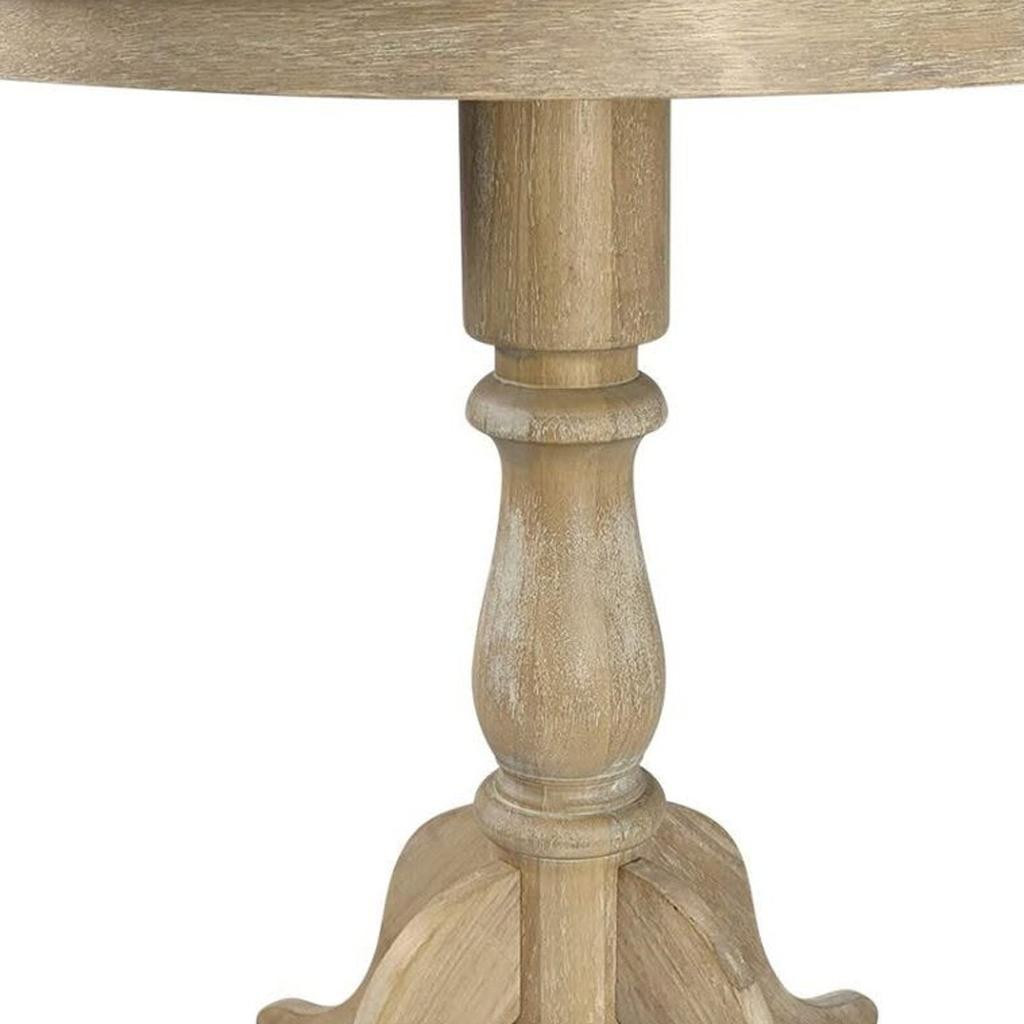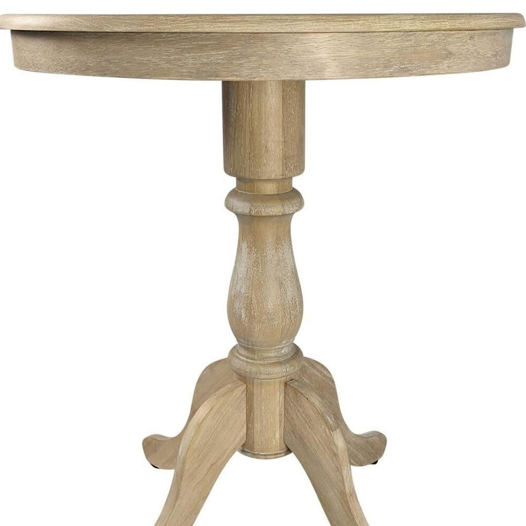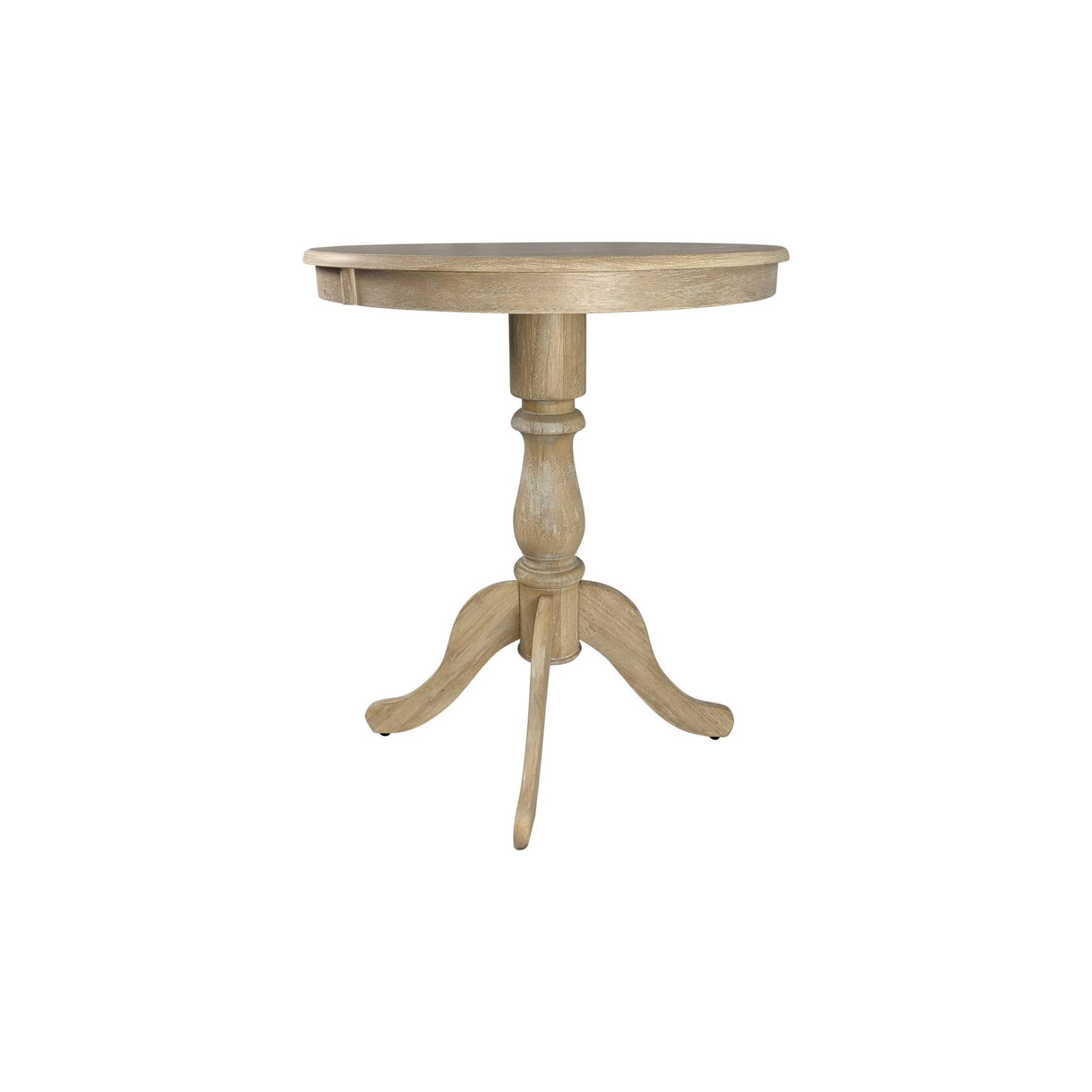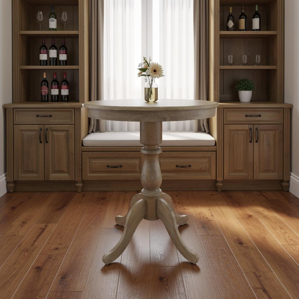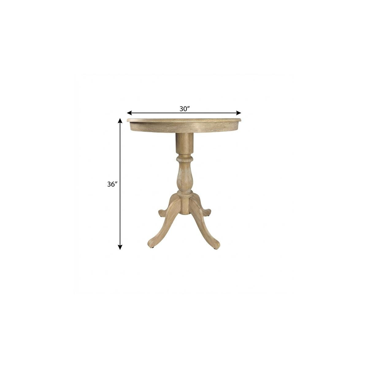 The 30-inch natural solid wood rounded bar table offers a blend of traditional charm and functional design. Crafted from solid wood, both the top and base feature a beautiful natural color that enhances any decor. The round tabletop creates an inviting space for conversation and dining. Its pedestal base provides stability while adding to the table's timeless aesthetic. This table showcases purposeful coat and paint distressing, giving it an authentic, rustic appeal. Being hand-crafted ensures that each piece is unique, reflecting the artisan's dedication to quality. The fixed table mechanism guarantees durability, making it ideal for both home bars and restaurant settings. Elevate your gathering area with this elegant yet practical bar table. 36.00-inch h x 30.00-inch w x 30.00-inch d.