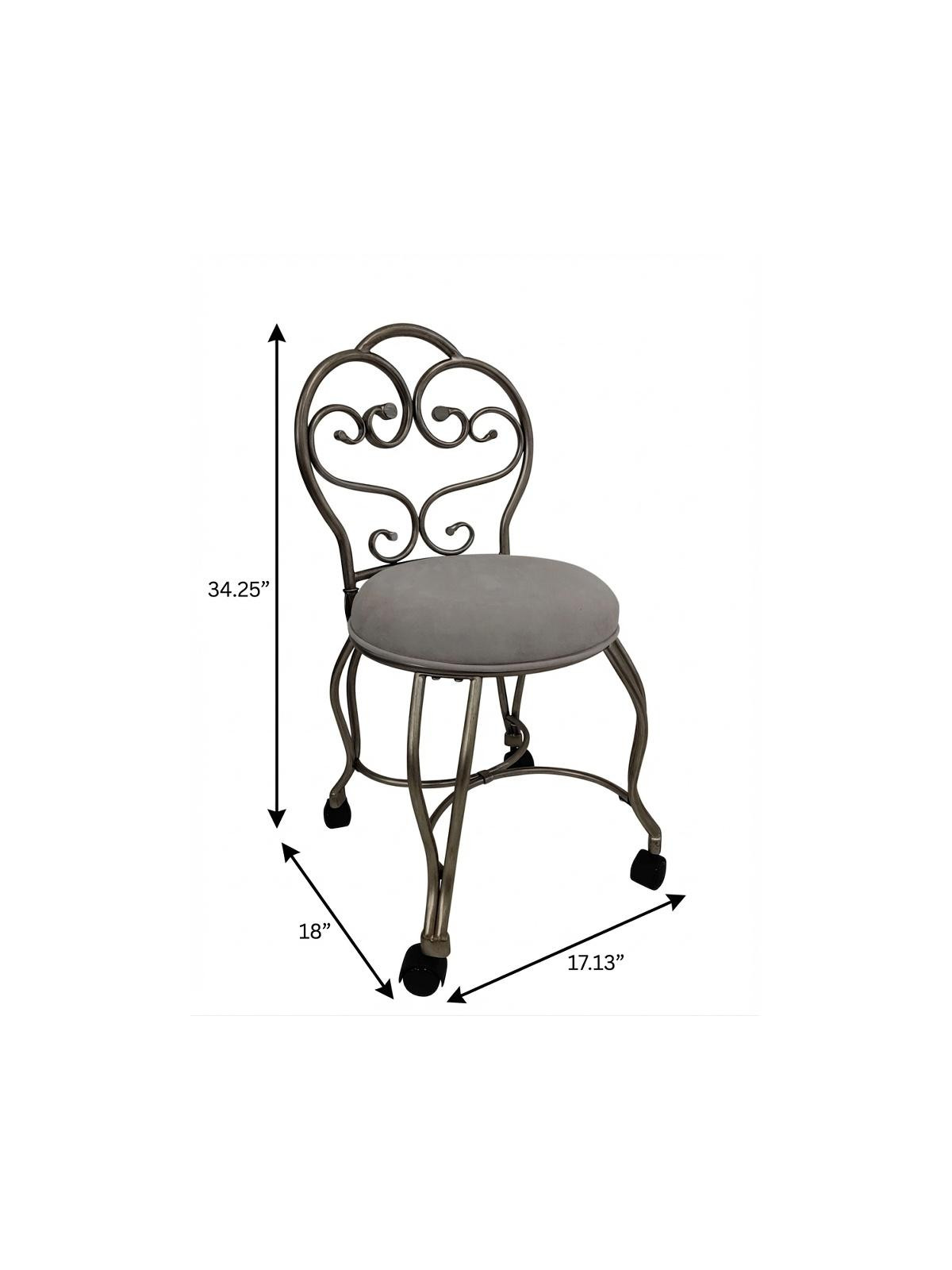 Distinctive in style the 18-inch cream and silver microfiber and metal upholstered round bench radiates a versatile charm. The cream upholstery top of this bench is a nice contrast to the high quality, silver metal of the base. An included back gives this bench an extra opportunity to keep you supported and comfortable. Adding this bench to the end of your bed is a great idea to help you get ready in the morning. Benches don't have to be unsightly. Increase your seating and the fashion quotient of your room all at the same time with this hard wearing, versatile, and good looking bench. 34.25-inch h x 18.00-inch w x 17.13-inch d.
