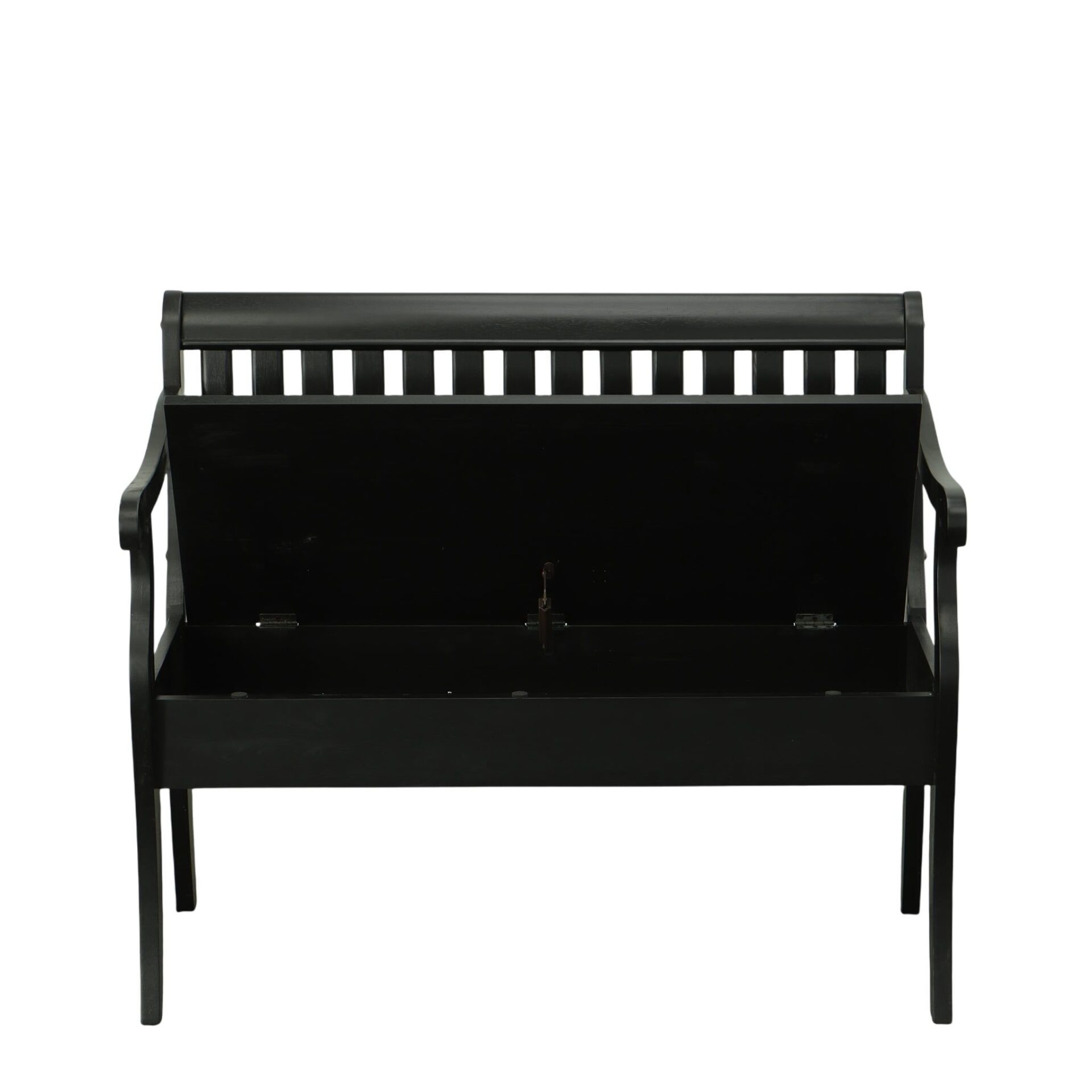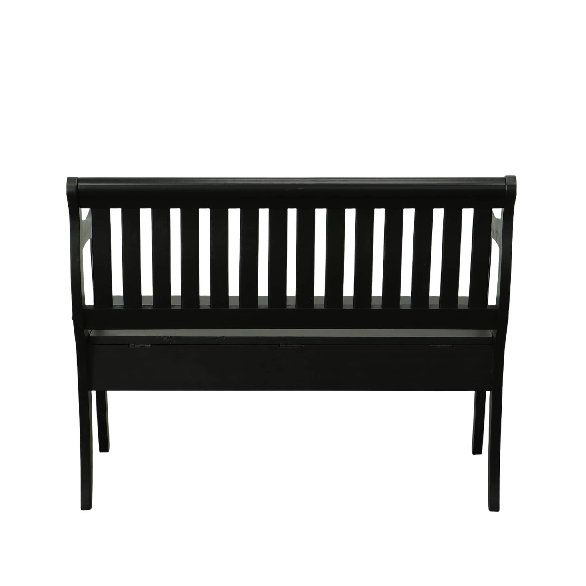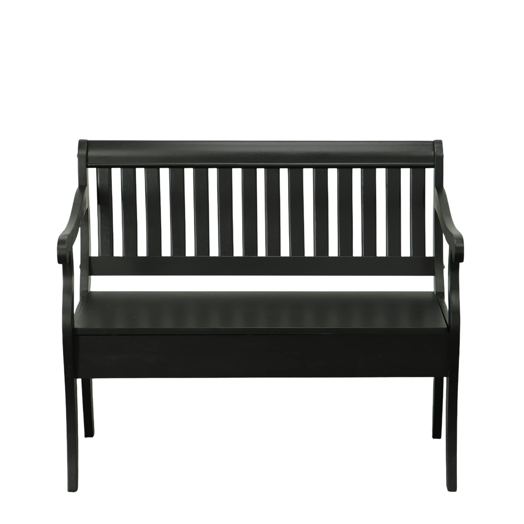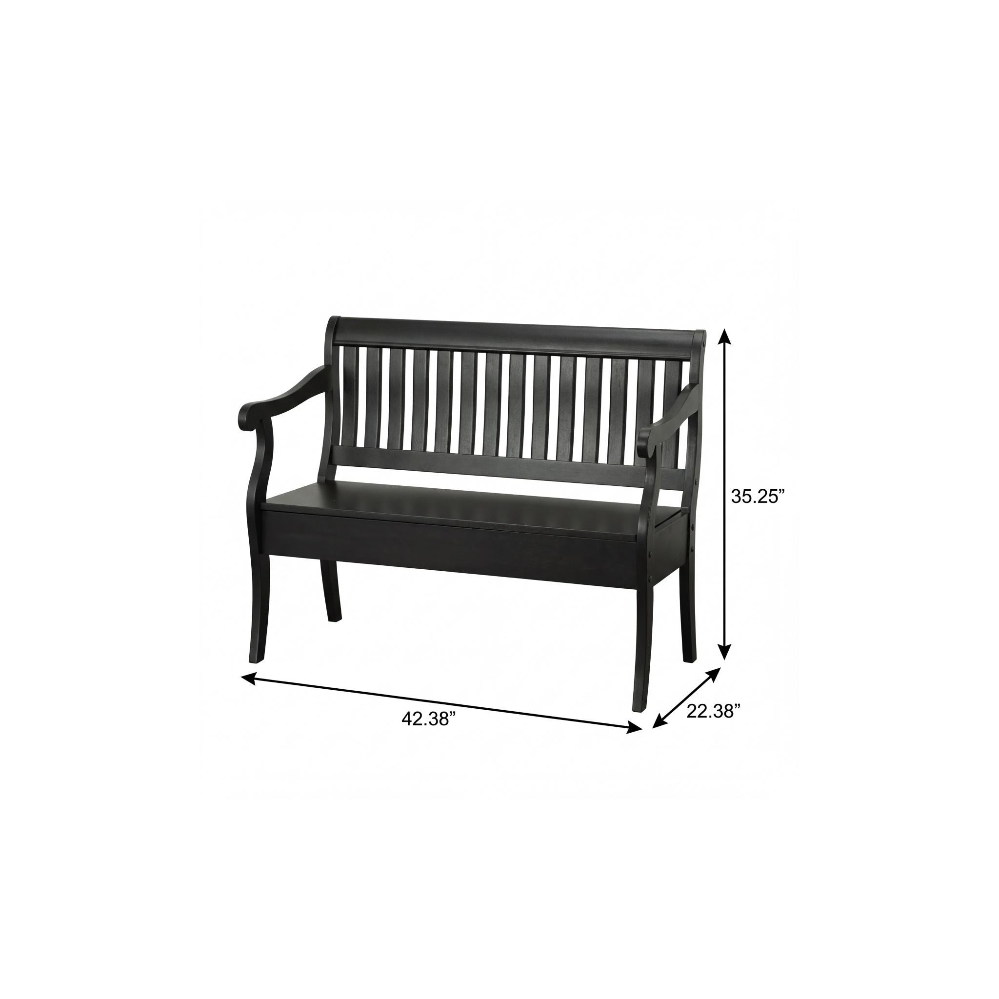 Distinctive in style the 42-inch black solid wood distressed storage bench with flip top radiates a versatile charm. This bench features quality construction from solid wood in an updated monotone color scheme with black as the main color throughout. Complete with a purposefully distressed finish, this bench has an aged, vintage, and rustic feel. A convenient flip top gives this bench multi-functionality to house hidden storage to help keep your space neat and tidy. Arms anchor this bench on either side for your comfort stability. An included back gives this bench an extra opportunity to keep you supported and comfortable. Ideal for entrance foyer, hallway, or laundry room. This bench is a great place store your keys, put on your shoes, or be a catchall on your way in or out. Easy to blend into most any room, a bench is a way to add a good looking accent to your space that can also be practical and useful. 35.25-inch h x 42.38-inch w x 22.38-inch d.