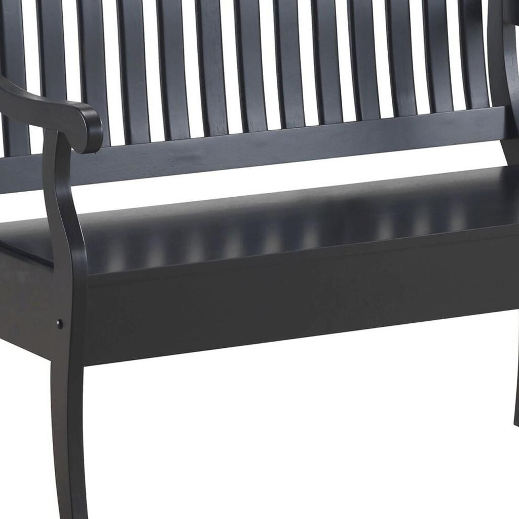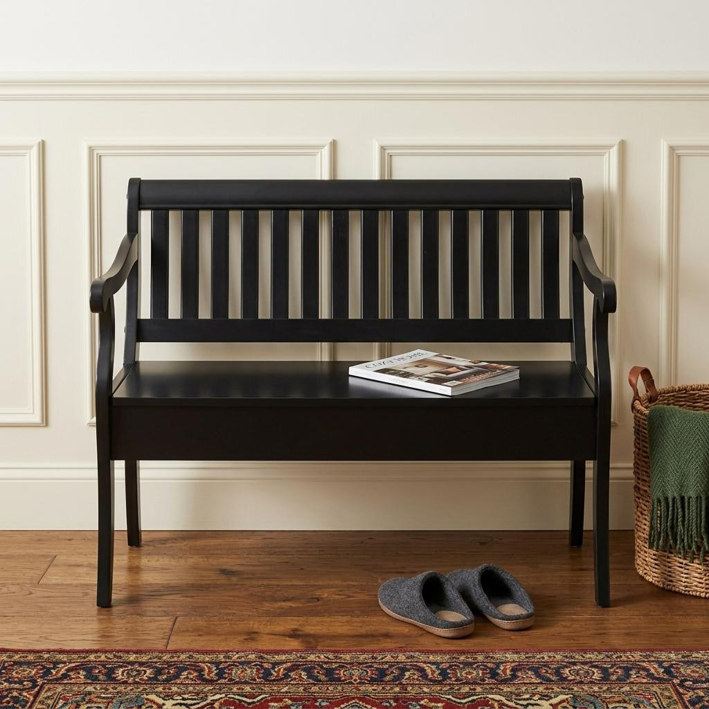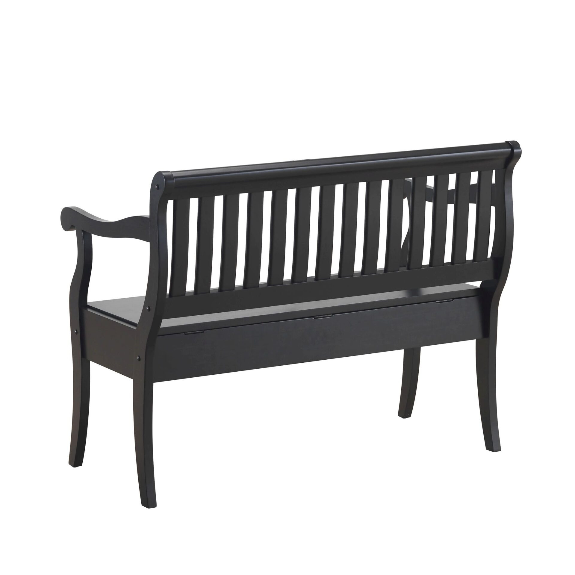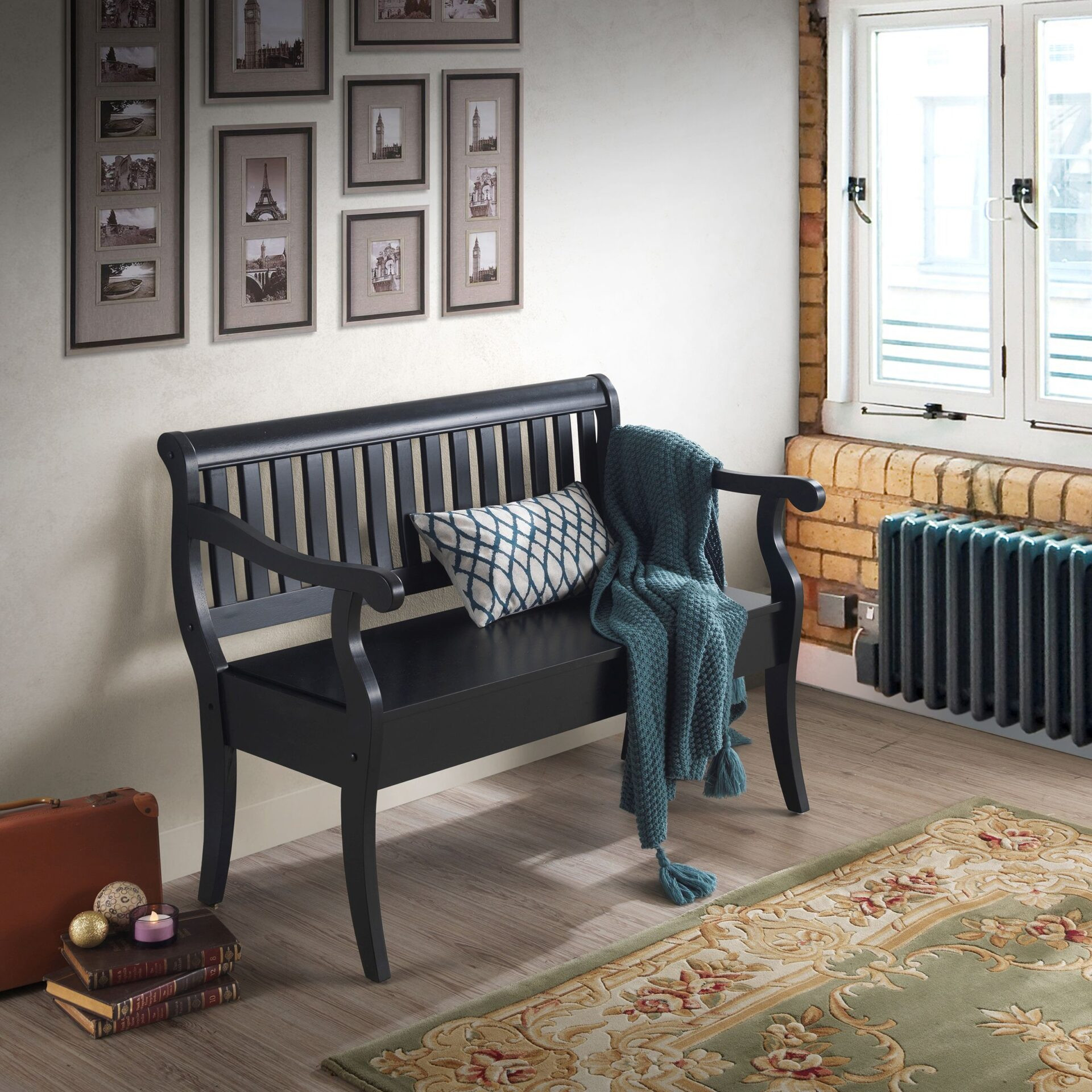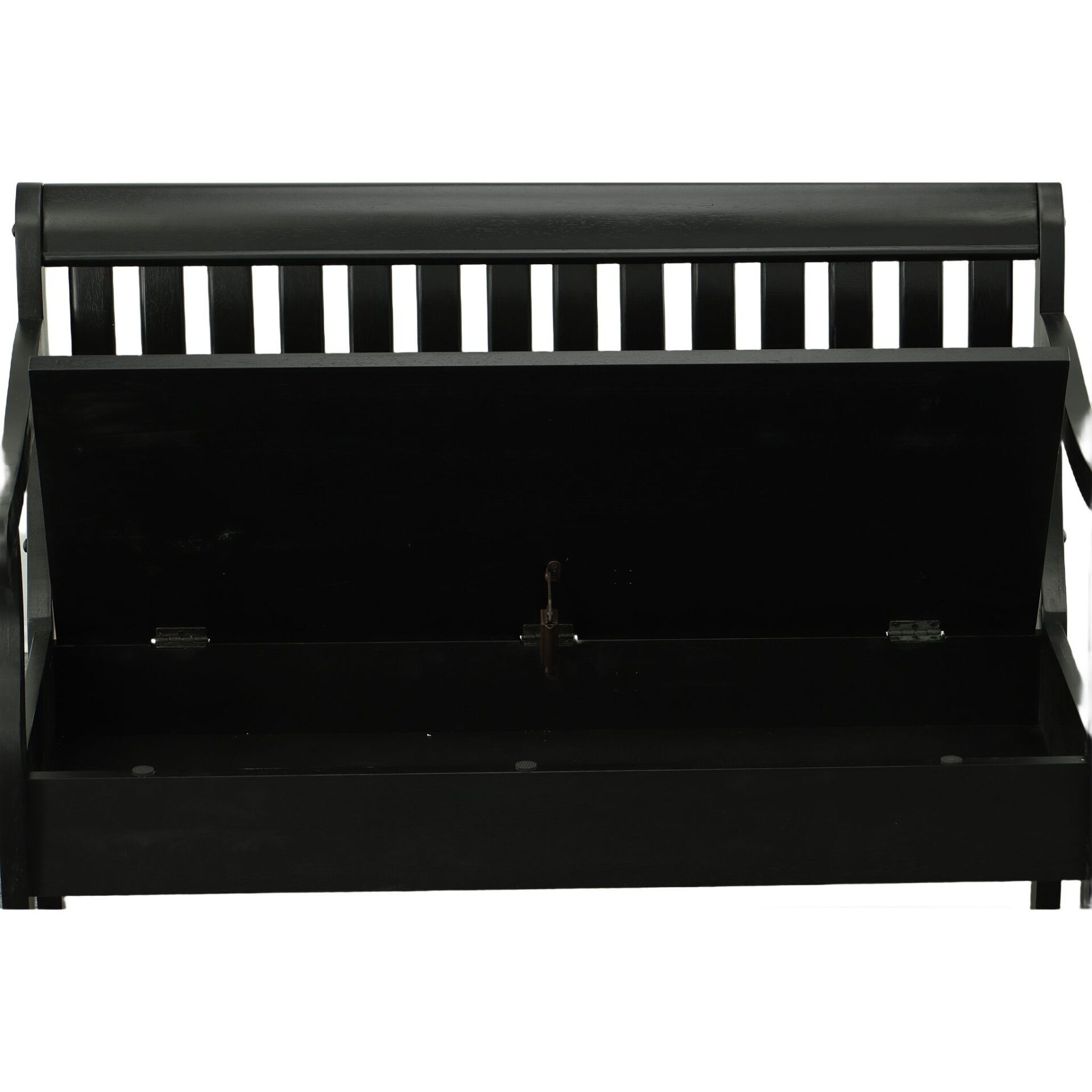 Distinctive in style the 42-inch black solid wood distressed storage bench with flip top radiates a versatile charm. This bench features quality construction from solid wood in an updated monotone color scheme with black as the main color throughout. Complete with a purposefully distressed finish, this bench has an aged, vintage, and rustic feel. A convenient flip top gives this bench multi-functionality to house hidden storage to help keep your space neat and tidy. Arms anchor this bench on either side for your comfort stability. An included back gives this bench an extra opportunity to keep you supported and comfortable. Ideal for entrance foyer, hallway, or laundry room. This bench is a great place store your keys, put on your shoes, or be a catchall on your way in or out. Easy to blend into most any room, a bench is a way to add a good looking accent to your space that can also be practical and useful. 35.25-inch h x 42.38-inch w x 22.38-inch d.