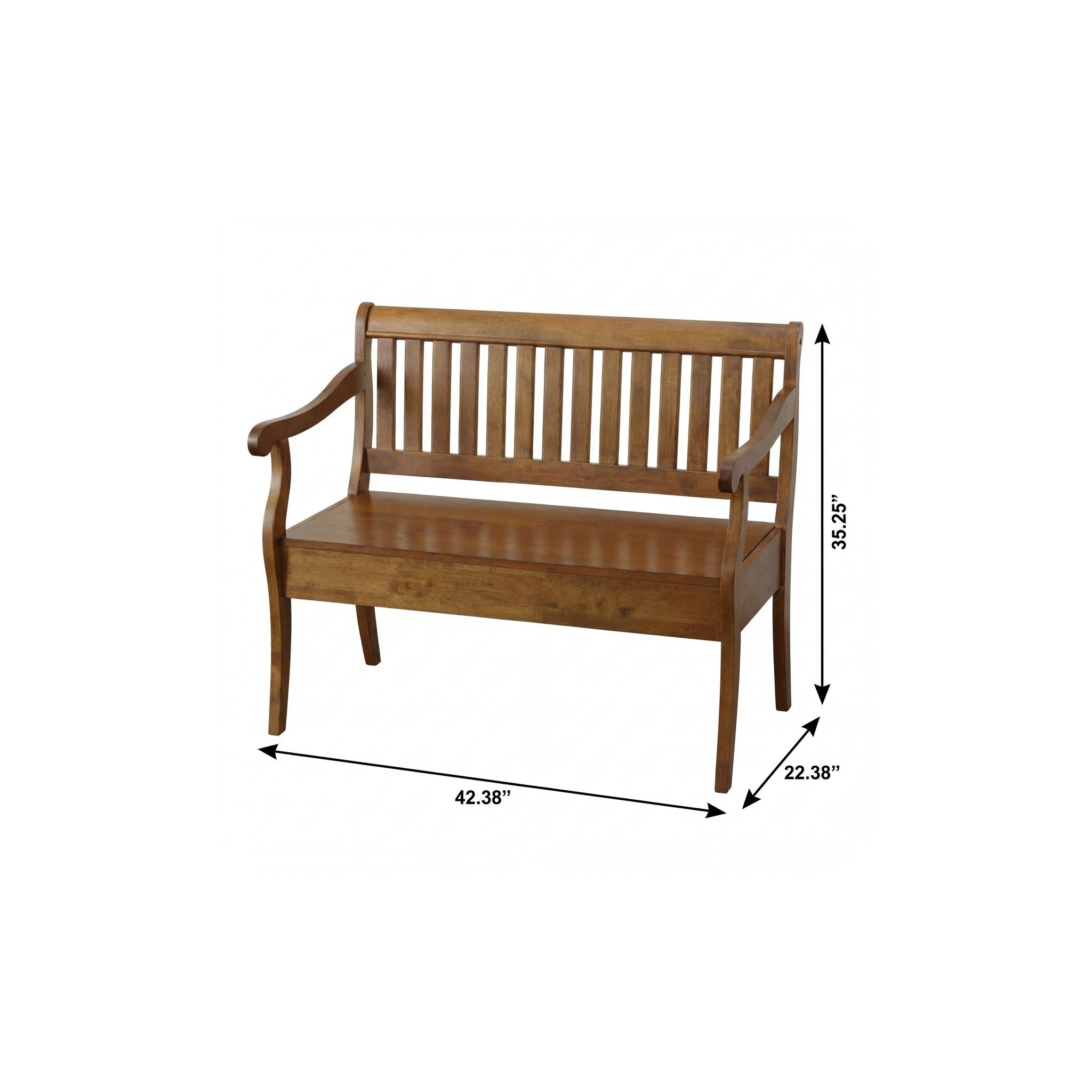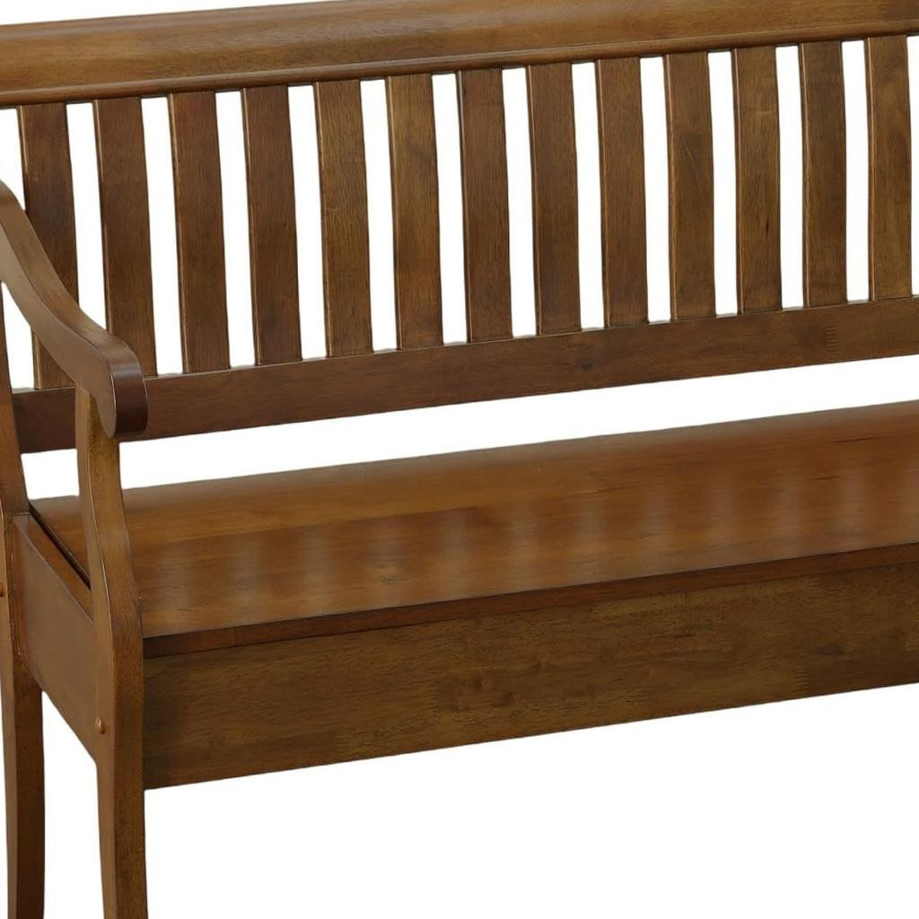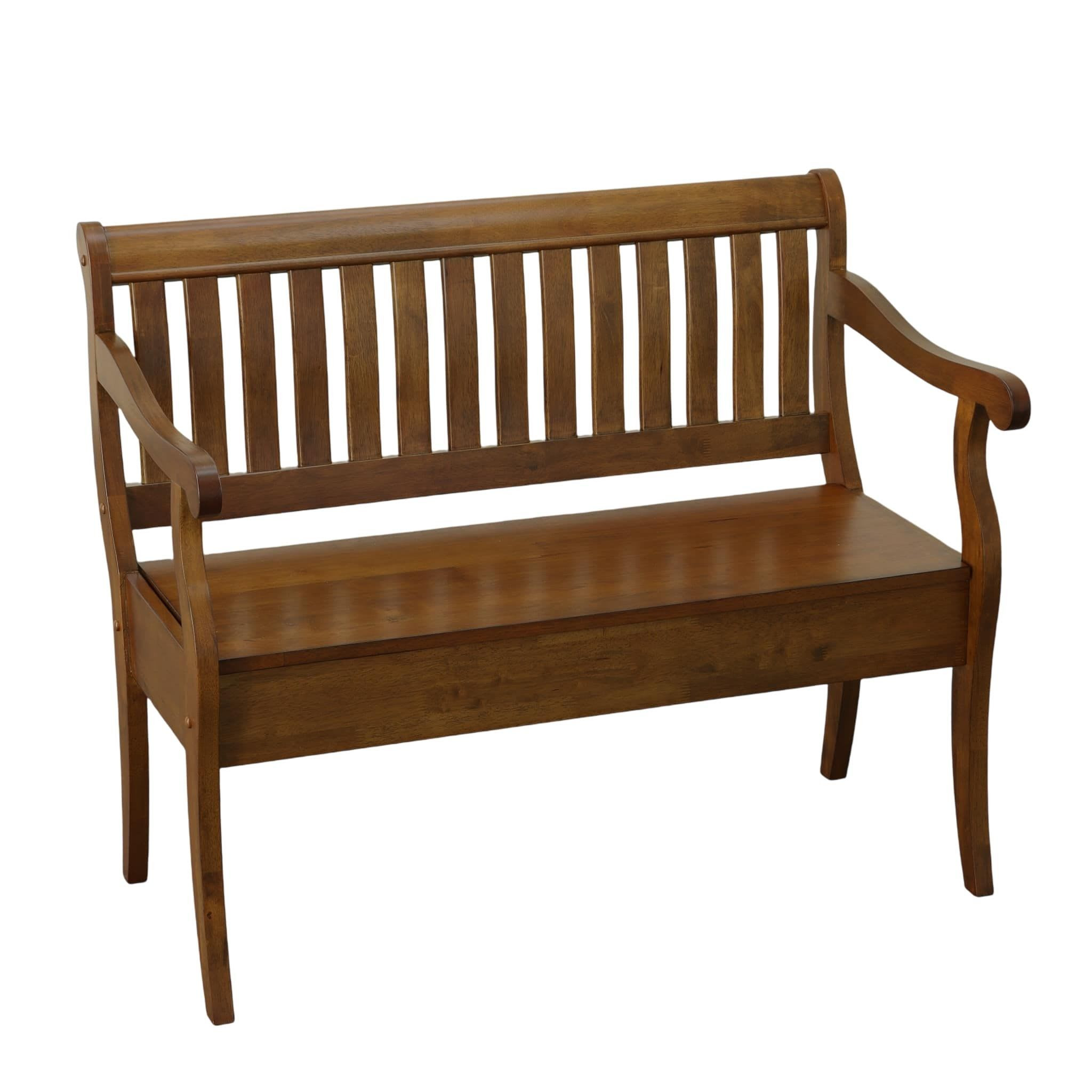 Distinctive in style the 42-inch dark brown solid wood storage bench with flip top radiates a versatile charm. This bench features quality construction from solid wood in an updated monotone color scheme with dark brown as the main color throughout. A convenient flip top gives this bench multi-functionality to house hidden storage to help keep your space neat and tidy. Arms anchor this bench on either side for your comfort stability. An included back gives this bench an extra opportunity to keep you supported and comfortable. Ideal for entrance foyer, hallway, or laundry room. This bench is a great place store your keys, put on your shoes, or be a catchall on your way in or out. Easy to blend into most any room, a bench is a way to add a good looking accent to your space that can also be practical and useful. 35.25-inch h x 42.38-inch w x 22.38-inch d.