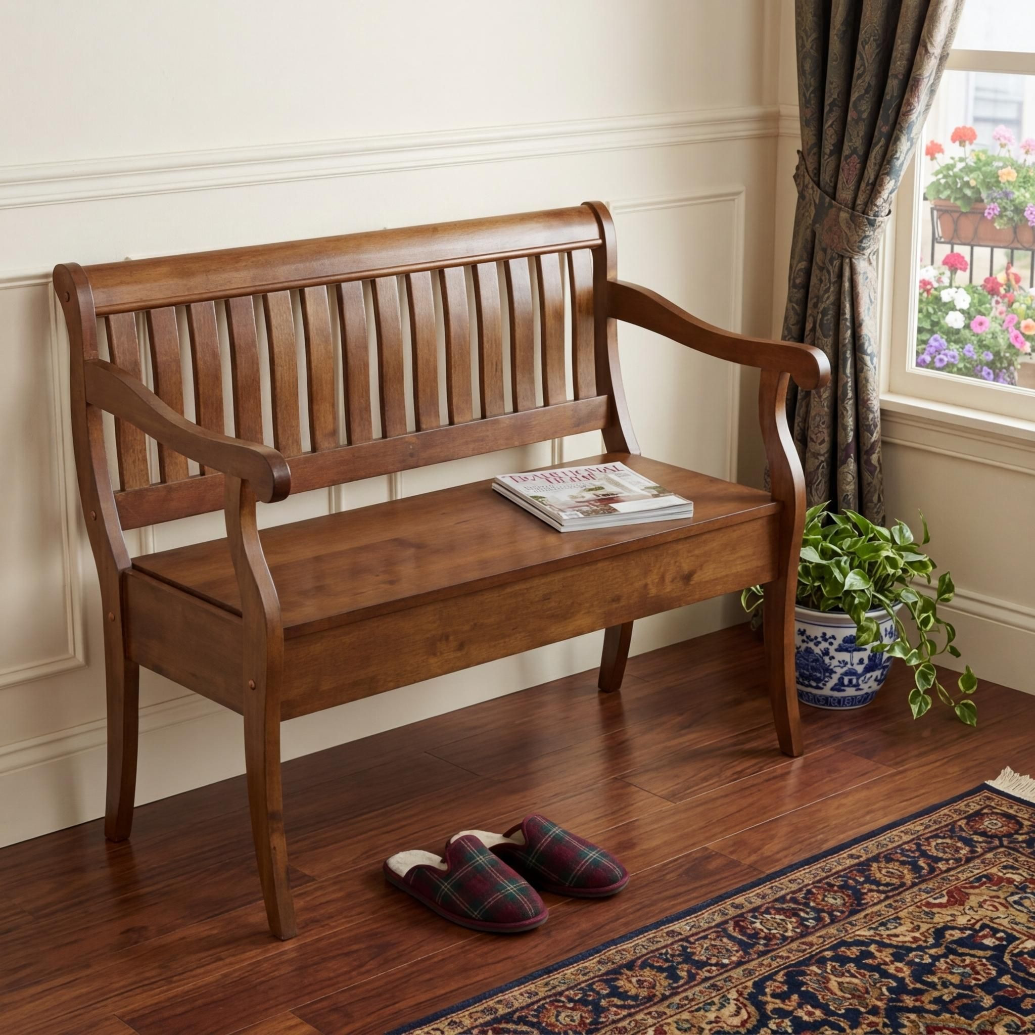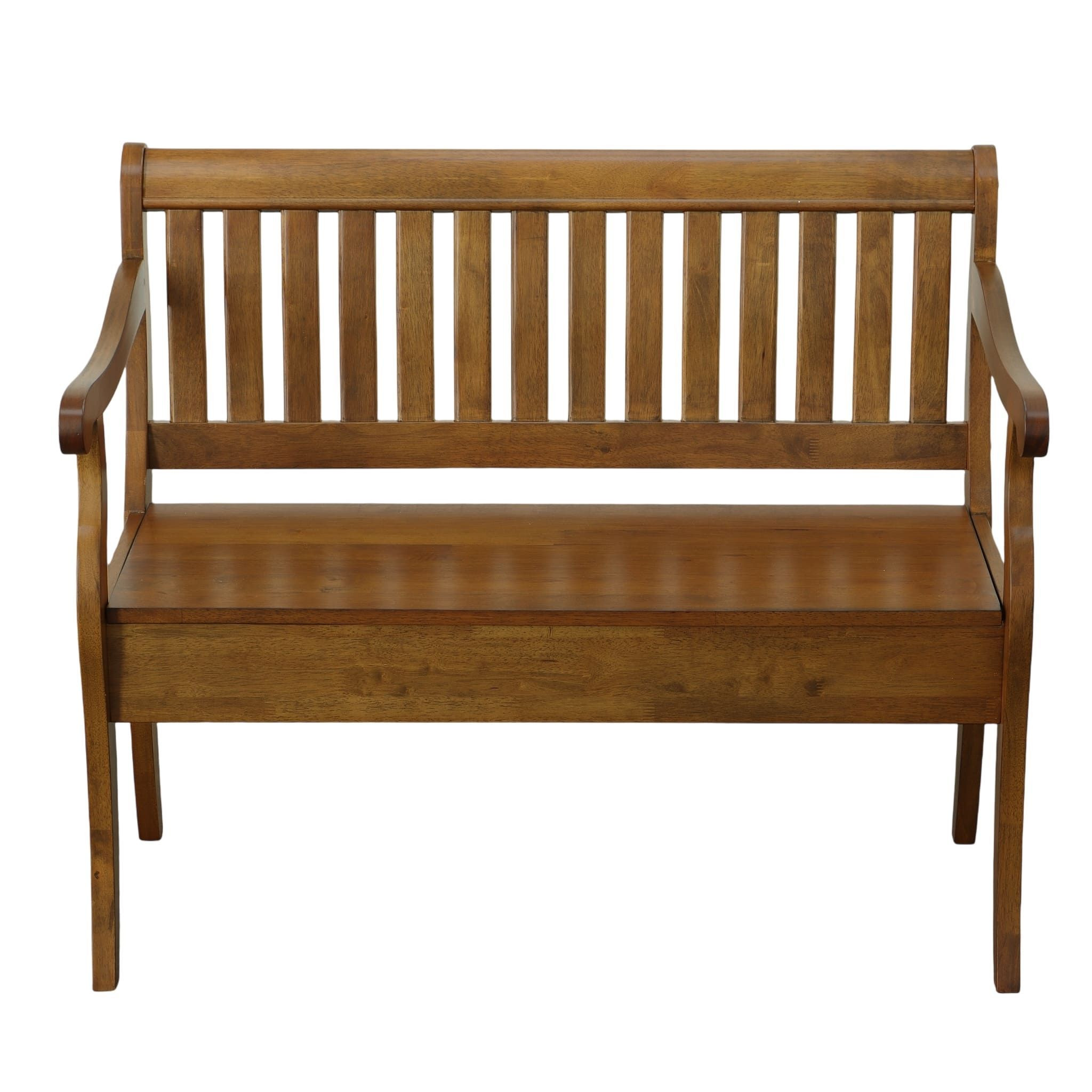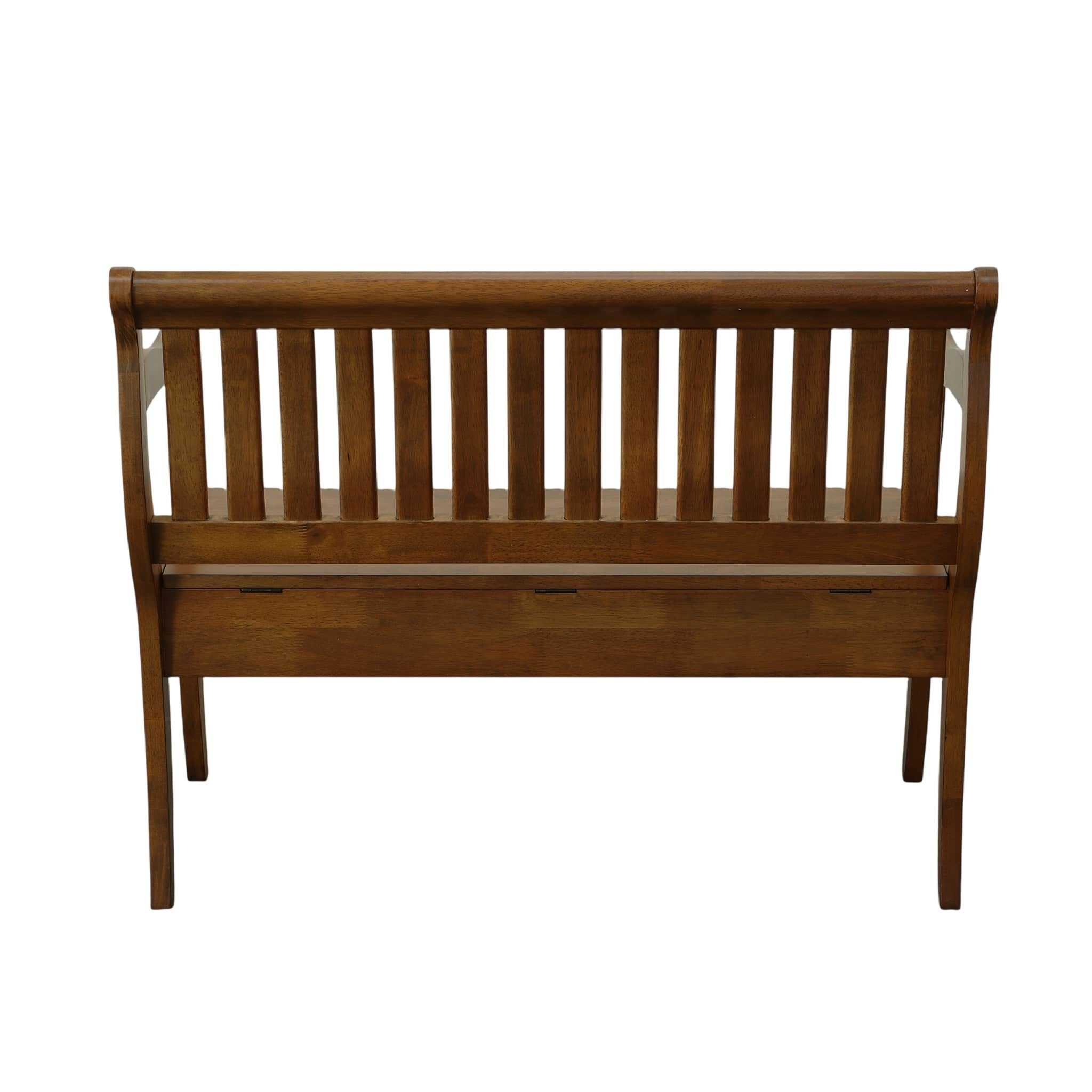 Distinctive in style the 42-inch dark brown solid wood storage bench with flip top radiates a versatile charm. This bench features quality construction from solid wood in an updated monotone color scheme with dark brown as the main color throughout. A convenient flip top gives this bench multi-functionality to house hidden storage to help keep your space neat and tidy. Arms anchor this bench on either side for your comfort stability. An included back gives this bench an extra opportunity to keep you supported and comfortable. Ideal for entrance foyer, hallway, or laundry room. This bench is a great place store your keys, put on your shoes, or be a catchall on your way in or out. Easy to blend into most any room, a bench is a way to add a good looking accent to your space that can also be practical and useful. 35.25-inch h x 42.38-inch w x 22.38-inch d.