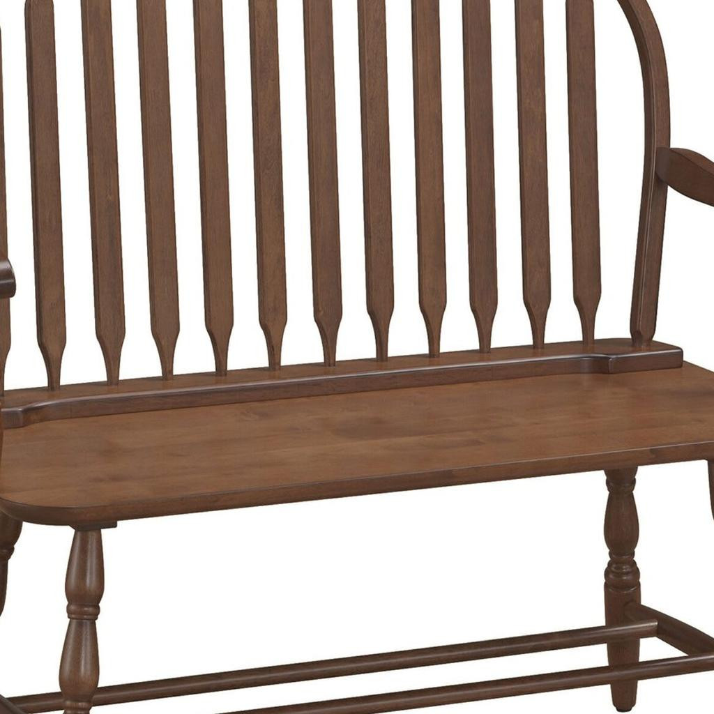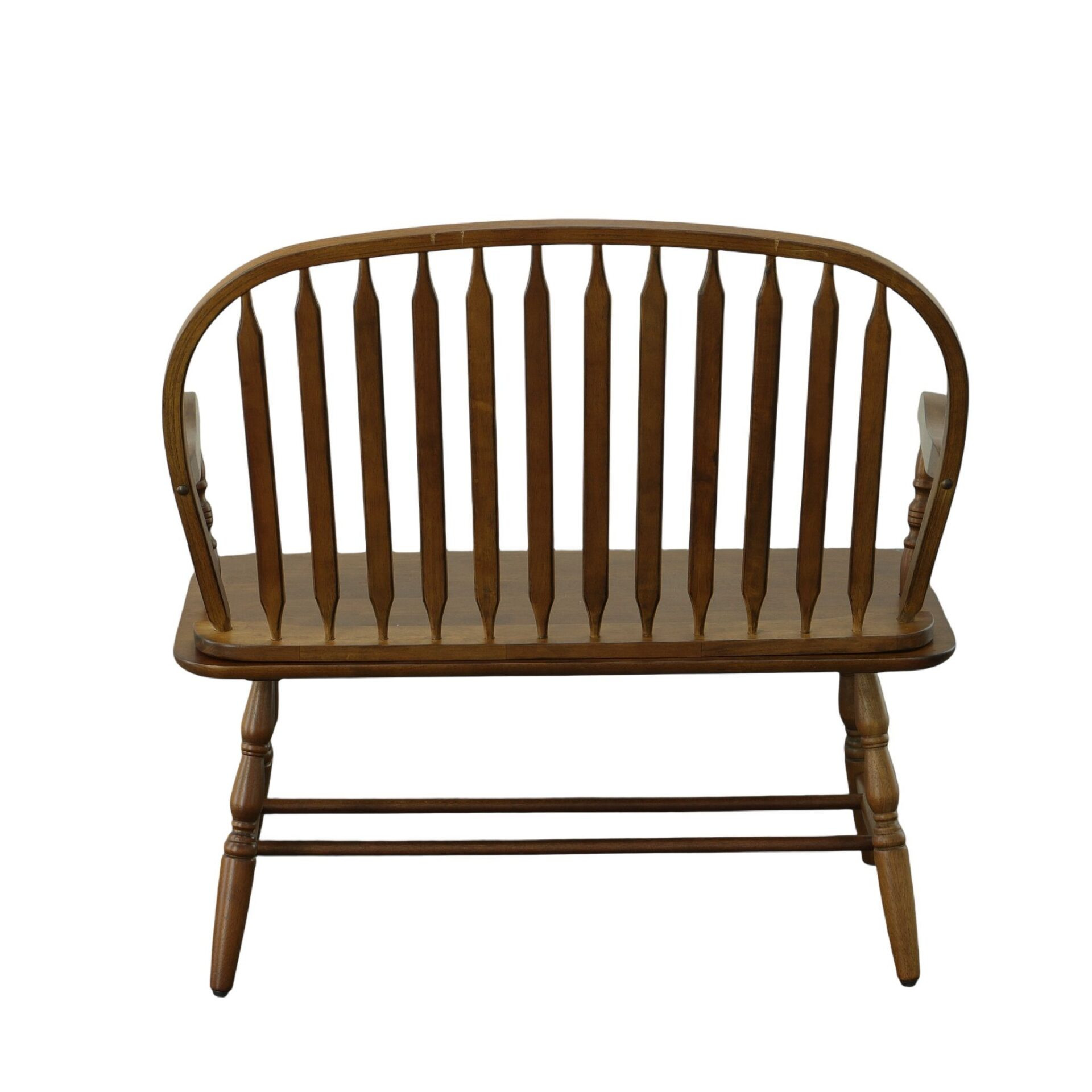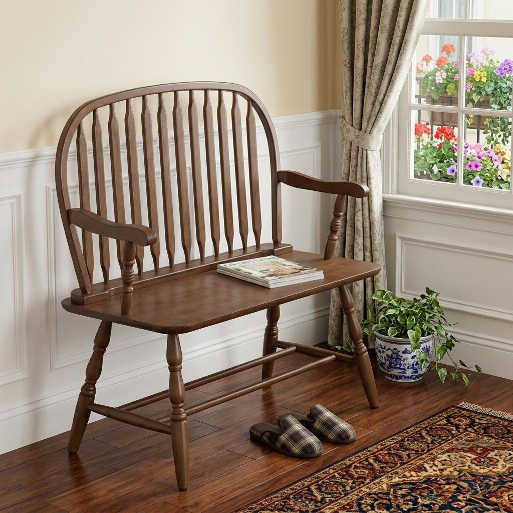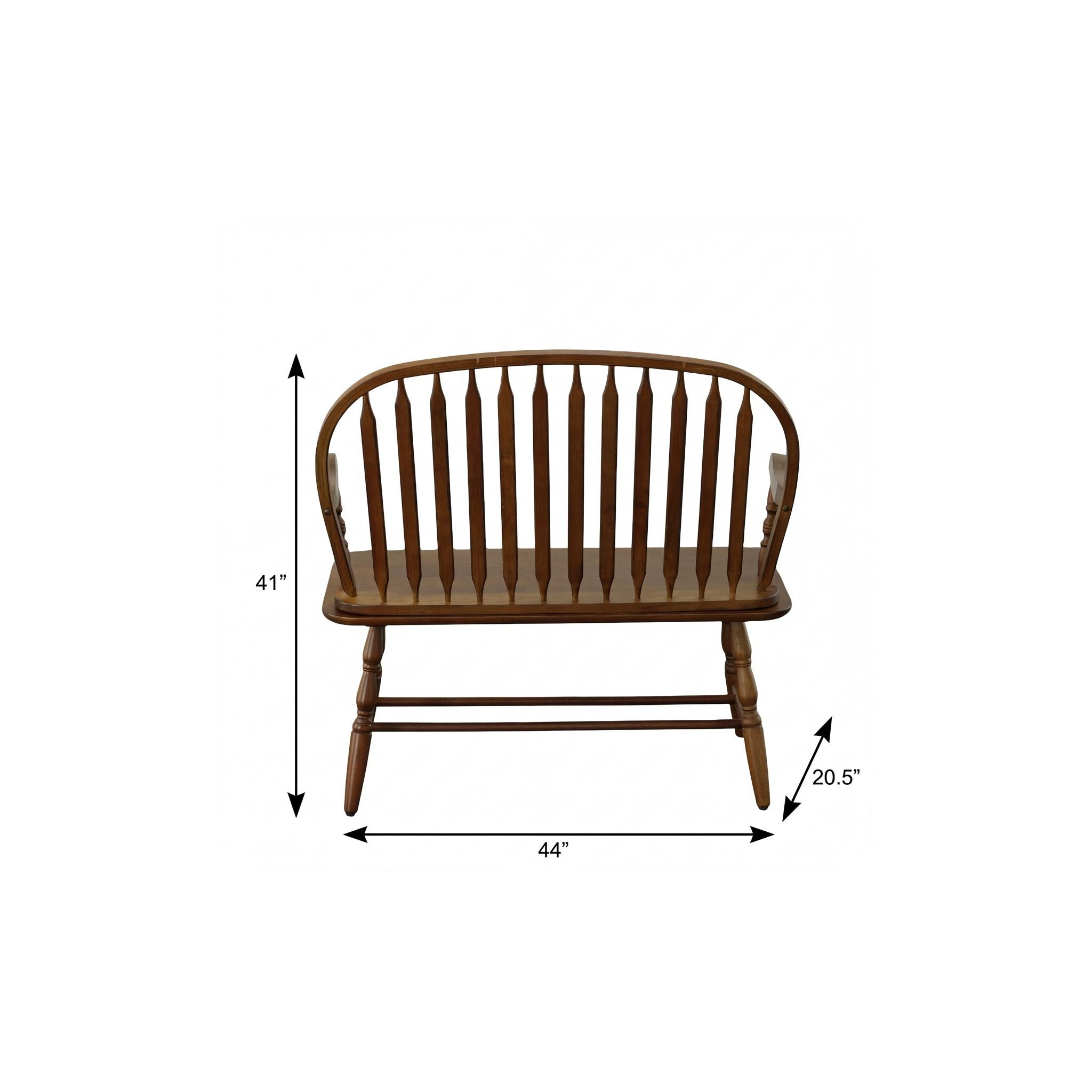 Optimize your space and add some charm to your room with the 44-inch dark brown solid wood bench. This bench features quality construction from solid wood in an updated monotone color scheme with dark brown as the main color throughout. Arms anchor this bench on either side for your comfort stability. An included back gives this bench an extra opportunity to keep you supported and comfortable. Ideal for entrance foyer, hallway, or laundry room. This bench is a great place store your keys, put on your shoes, or be a catchall on your way in or out. Easy to blend into most any room, a bench is a way to add a good looking accent to your space that can also be practical and useful. 41.00-inch h x 44.00-inch w x 20.50-inch d.