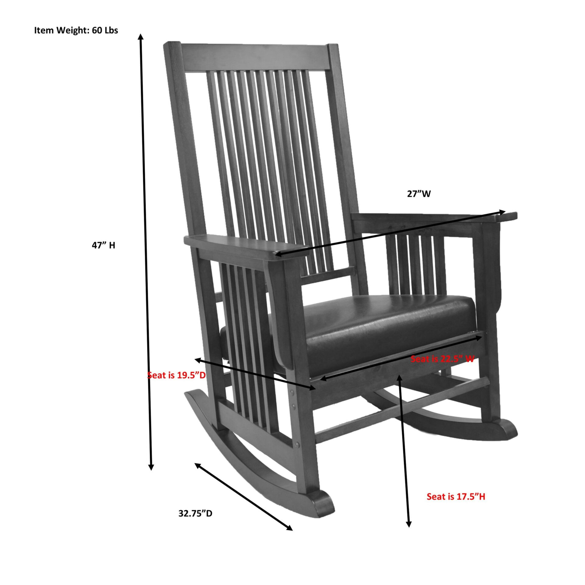 27-inch brown and chestnut faux leather and solid wood rocking chair offers a perfect blend of comfort and elegance. The chair features a beautifully upholstered seat cushion in rich brown faux leather, ensuring both style and relaxation. Crafted from solid rubberwood, the frame showcases a warm chestnut color that enhances its traditional aesthetic. Each piece is meticulously hand-crafted, adding a unique touch to your home decor. As a classic rocking chair, it invites soothing motion, making it an ideal addition to your living space. The upholstered design not only elevates comfort but also complements a variety of interior styles, making it a versatile choice for any room. Enjoy a moment of calm and tranquility with this exquisite rocking chair. 47.00-inch h x 27.00-inch w x 32.75-inch d.