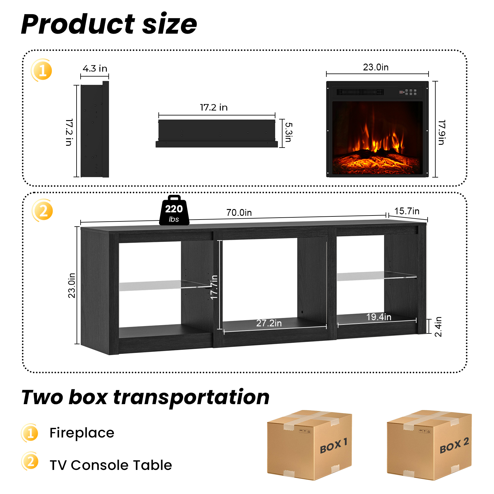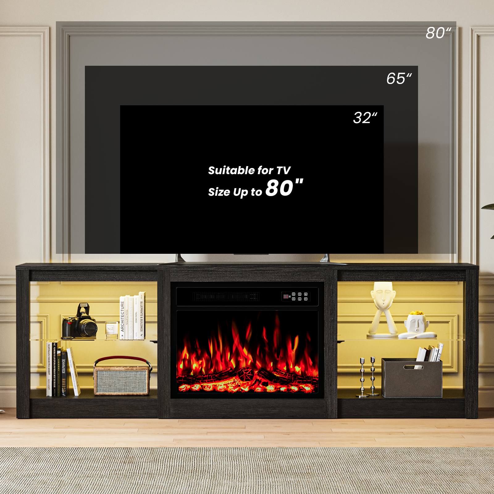 Ready to be enjoyed in your living room, family room, or recreation room, this 70-inch black wood fireplace entertainment center with fireplace is a practical and good looking piece of furniture that will help to anchor your room. Designed to be sturdy and long lasting, this versatile furniture piece is crafted from durable manufactured wood and features a modern design style. To add to the versatility, this piece features open non-concealed storage that can be used for not only storage but display as well. A built-in cable and wire management helps to keep those unseemly wires at bay. Not only practical for your tv, this gorgeous furniture piece is also a electric fireplace that will give your room such warm and comfy vibes. Ideal for tv placement and storage in your living room, bedroom or office. 23.00-inch h x 70.00-inch w x 15.70-inch d.