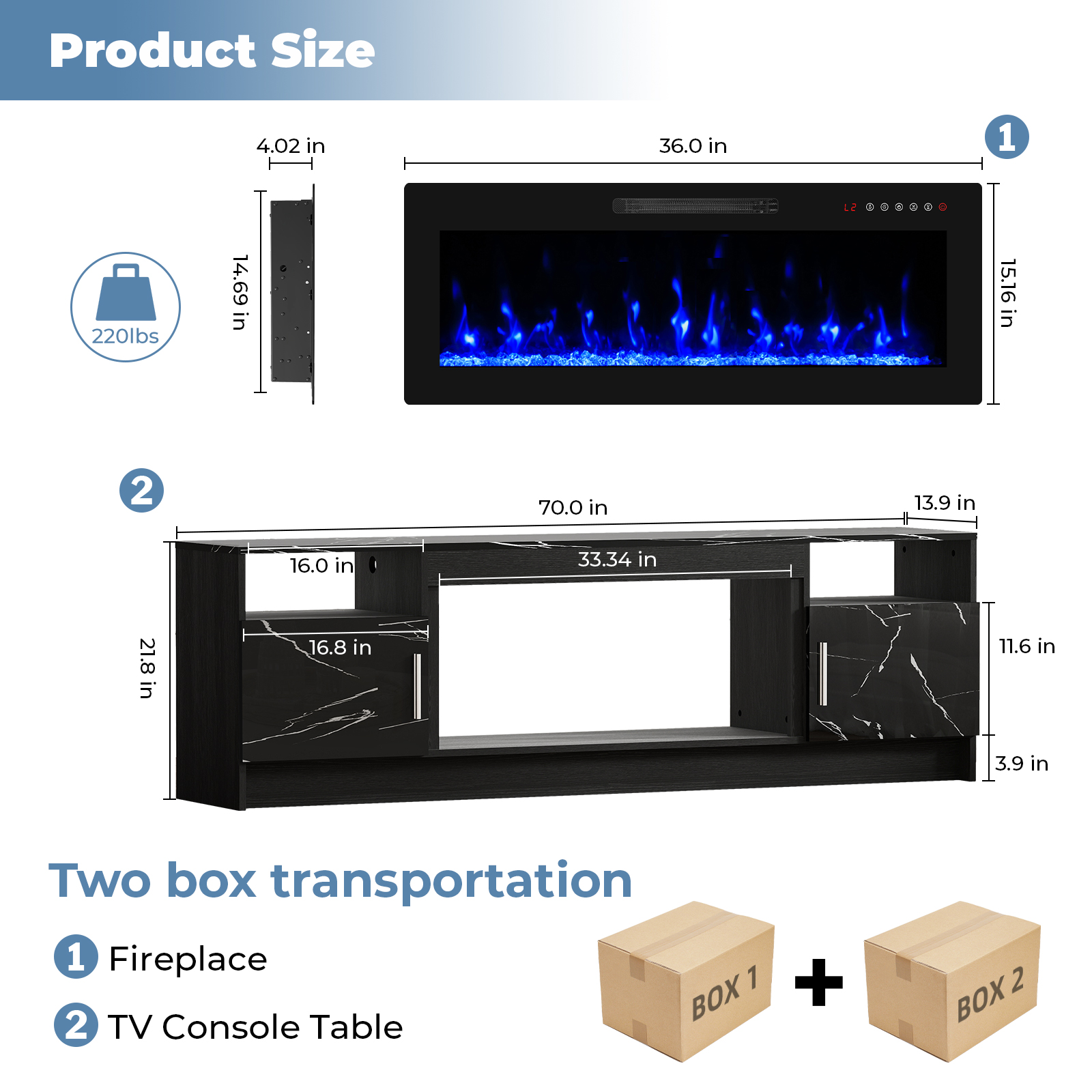 Create the ultimate blend of style, function, and design with this 70-inch black wood fireplace tv stand with fireplace. Designed to be sturdy and long lasting, this versatile furniture piece is crafted from durable manufactured wood and features a modern design style. To add to the versatility, this piece features open non-concealed storage that can be used for not only storage but display as well. A cord cut out hole is ideal for wire and cable management to keep your space look tidy. Create a fabulous and comfortable media experience as you watch tv on this stand that is also a warm and cozy electric fireplace. Ideal for tv placement and storage in your living room, bedroom or office. 21.80-inch h x 70.00-inch w x 13.90-inch d.