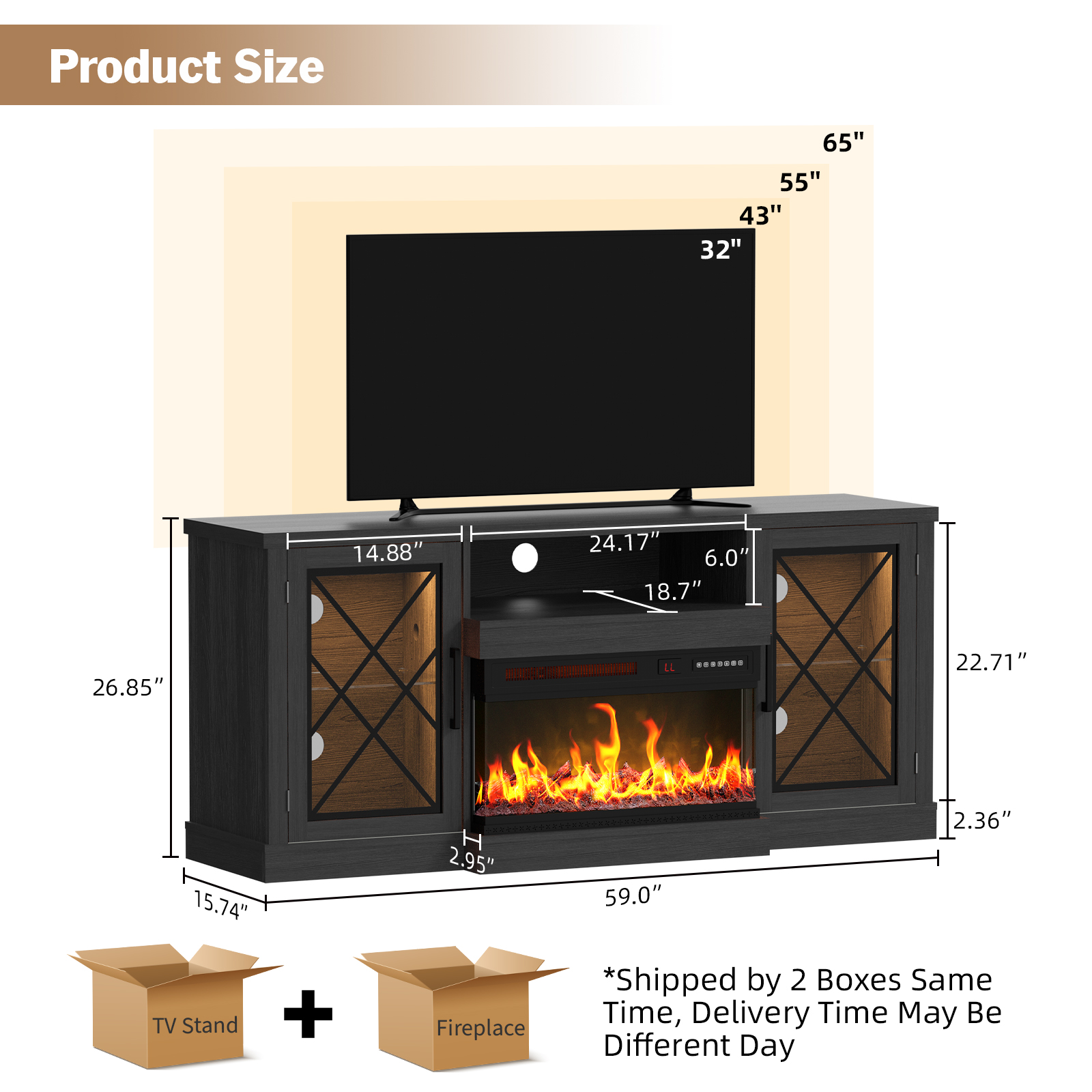 Make a true home theater of your room with this captivating 59-inch black wood fireplace tv stand with fireplace. Designed to be sturdy and long lasting, this versatile furniture piece is crafted from durable manufactured wood and features a modern design style. To add to the versatility, this piece features open non-concealed storage that can be used for not only storage but display as well. A built-in cable and wire management helps to keep those unseemly wires at bay. Create a fabulous and comfortable media experience as you watch tv on this stand that is also a warm and cozy electric fireplace. Ideal for tv placement and storage in your living room, bedroom or office. 26.85-inch h x 59.00-inch w x 15.74-inch d.