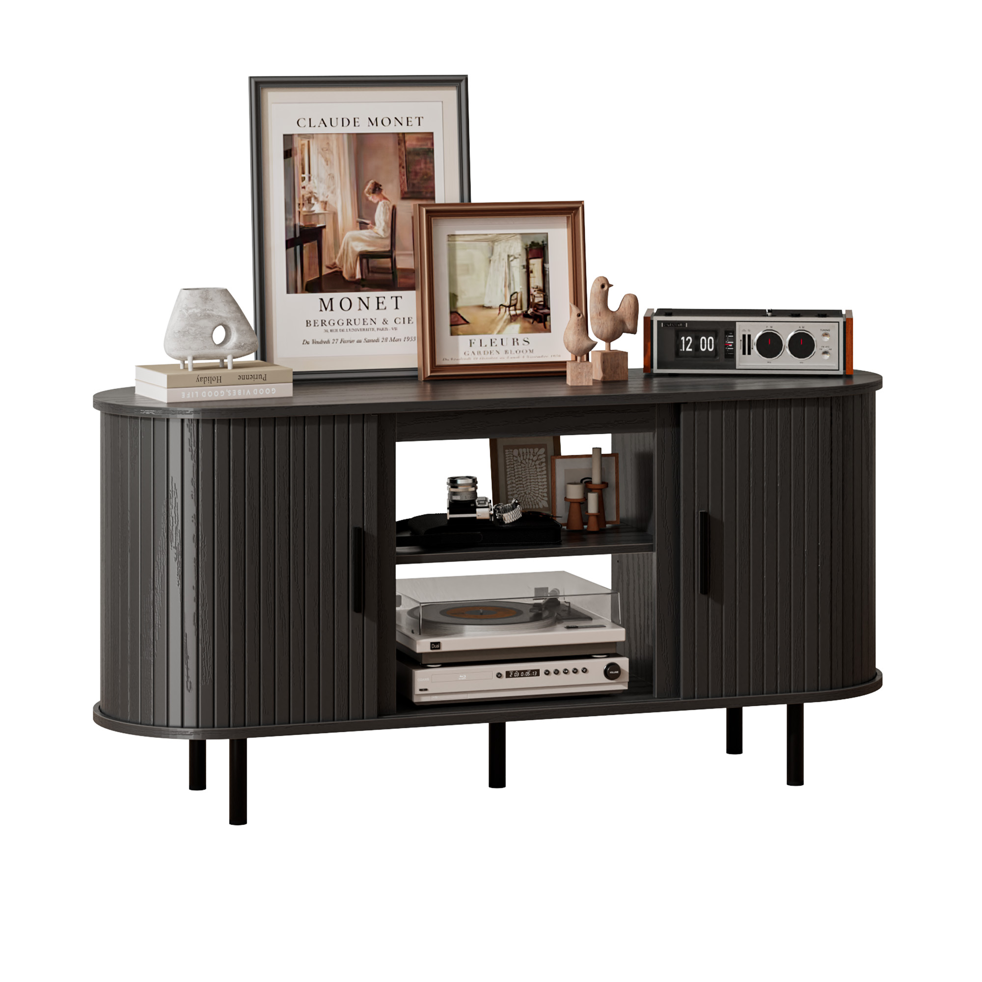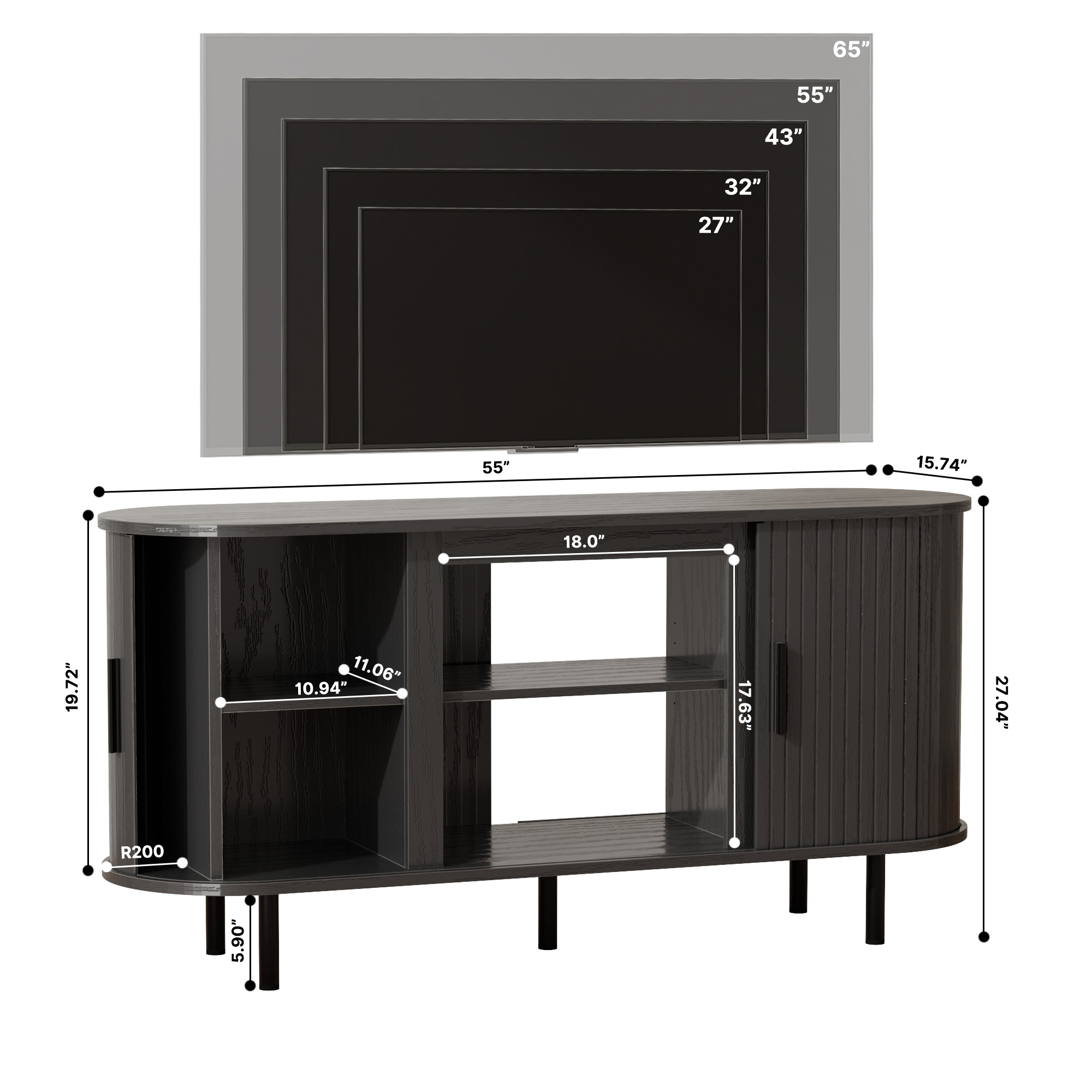 Practical, space saving, and good looking, this 55-inch black wood fireplace tv stand with fireplace is a versatile media storage solution. Designed to be sturdy and long lasting, this versatile furniture piece is crafted from durable manufactured wood and features a modern design style. To add to the versatility, this piece features open non-concealed storage that can be used for not only storage but display as well. A cord cut out hole is ideal for wire and cable management to keep your space look tidy. Create a fabulous and comfortable media experience as you watch tv on this stand that is also a warm and cozy electric fireplace. Ideal for tv placement and storage in your living room, bedroom or office. 27.04-inch h x 55.00-inch w x 15.74-inch d.