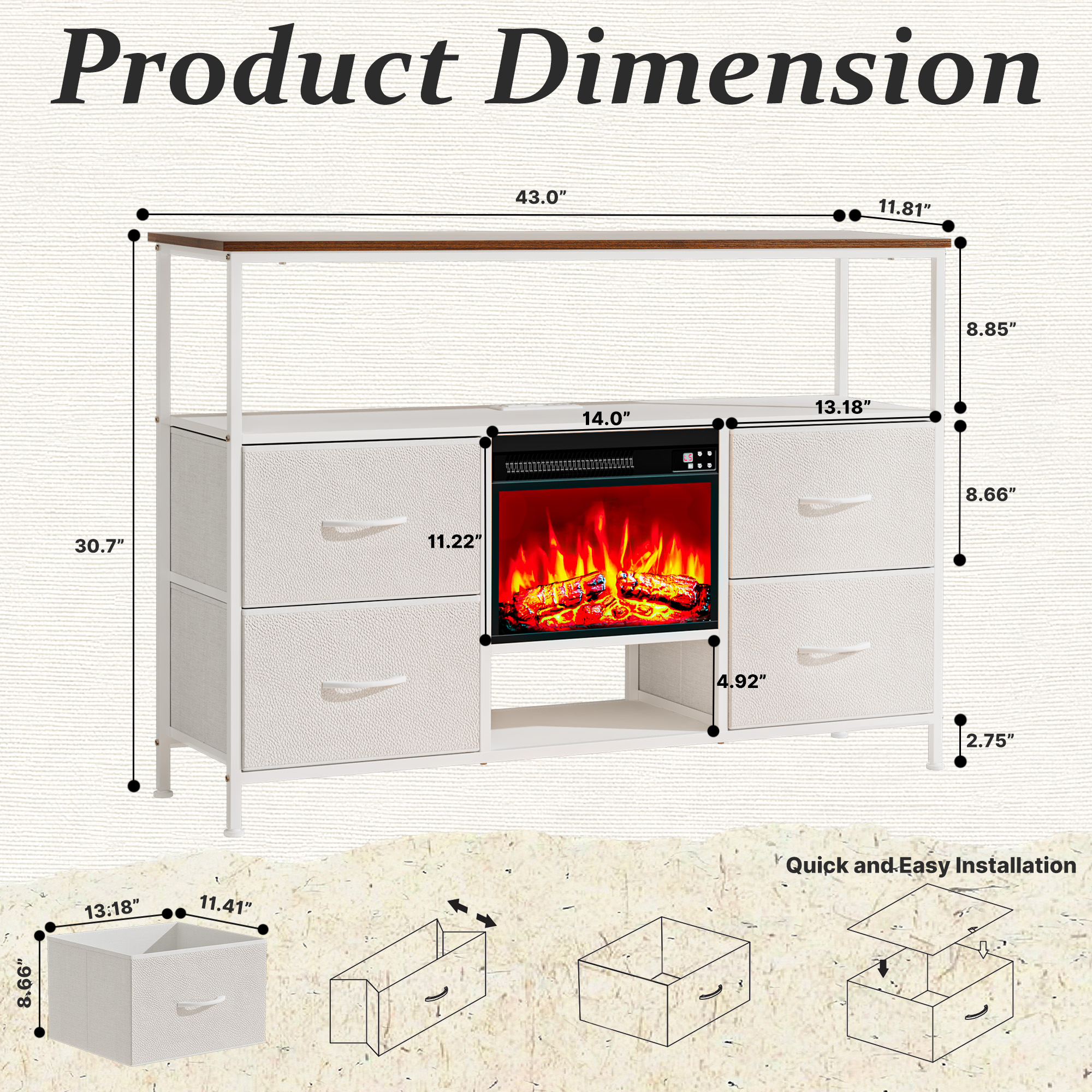 Make a true home theater of your room with this captivating 43-inch white wood fireplace tv stand with fireplace. Designed to be sturdy and long lasting, this versatile furniture piece is crafted from durable manufactured wood and features a modern design style. To add to the versatility, this piece features open non-concealed storage that can be used for not only storage but display as well. A built-in cable and wire management helps to keep those unseemly wires at bay. Create a fabulous and comfortable media experience as you watch tv on this stand that is also a warm and cozy electric fireplace. Ideal for tv placement and storage in your living room, bedroom or office. 30.70-inch h x 43.00-inch w x 11.81-inch d.
